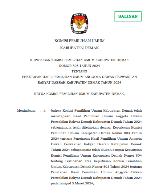 - Pengumuman Penetapan Hasil Pemilihan Anggota DPRD Kabupaten Demak Tahun 2024 unduh disini
