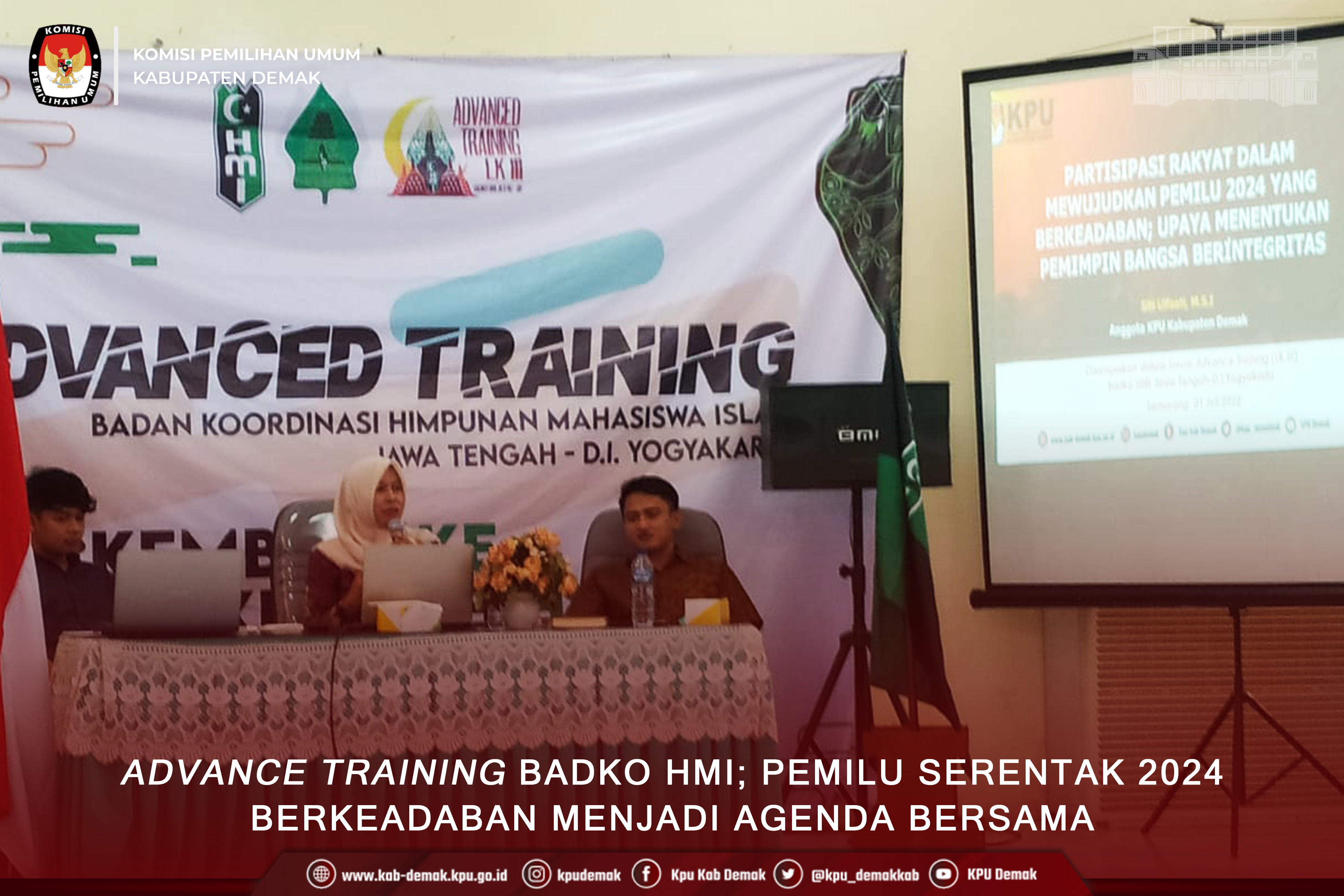 Semarang – Pemilihan Umum (Pemilu) 2024 berkeadaban adalah agenda kita semua. Dalam upaya mewujudkan partisipasi masyarakat untuk menentukan pemimpin bangsa berintregitas dan membentuk Pemilu Serentak 2024 yang berkeadaban bukan hanya tanggung jawab Komisi Pemilihan Umum (KPU) saja, tapi menjadi agenda kita semua, baik partai politik, mahasiswa dan seluruh masyarakat Indonesia, karena Pemilu Serentak 2024 ini menjadi hajat kita bersama. Tentu Sinergitas dari penyelenggara pemilu, peserta pemilu dan seluruh masyarakat adalah kunci upaya mewujudkan pemilu yang berintegritas dan berkeadaban, terang Anggota KPU Kabupaten Demak Divisi Sosialisasi, Pendidikan Pemilih, Partisipasi Masyarakat dan SDM, Siti Ulfaati dalam penyampaian materi di forum Advance Training Latihan Kader III Badan Koordinasi Himpunan Mahasiwa Islam (Badko HMI) Jawa Tengah-D.I.Yogyarta (Jumat/01/2022).