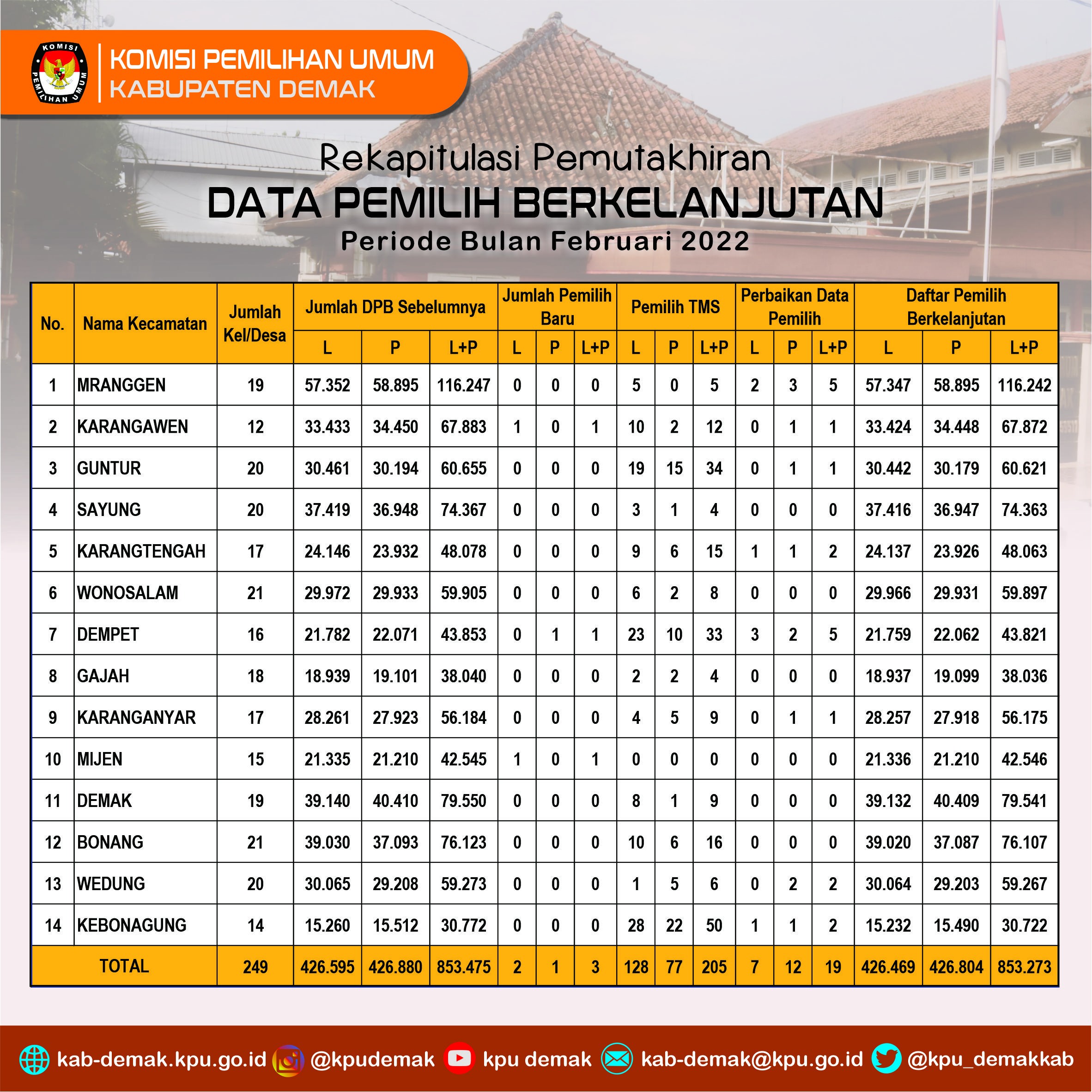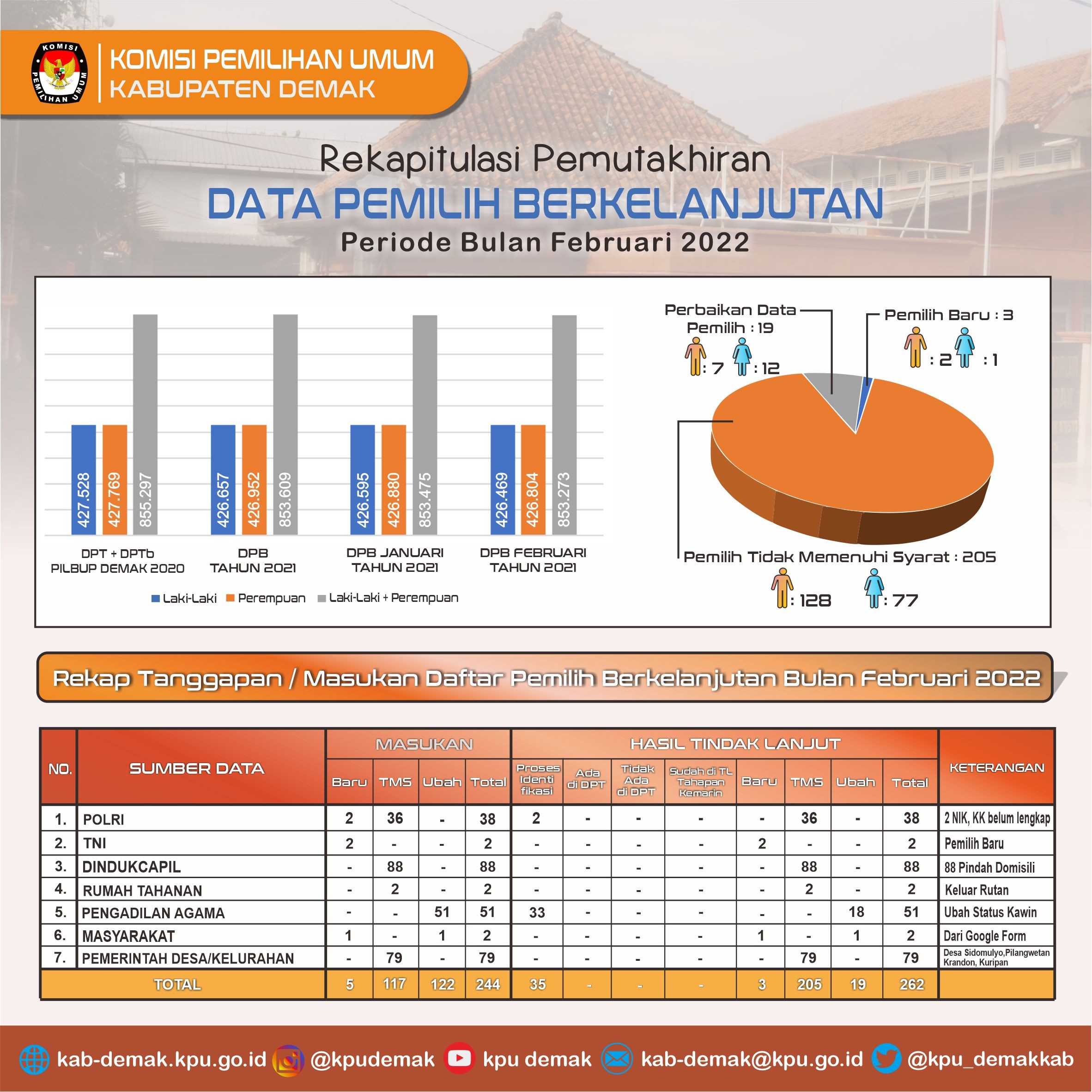 Berikut infografik Rekapitulasi Pemutakhiran Daftar Pemilih Berkelanjutan (DPB) Periode Bulan Februari 2022 di Kabupaten Demak.
