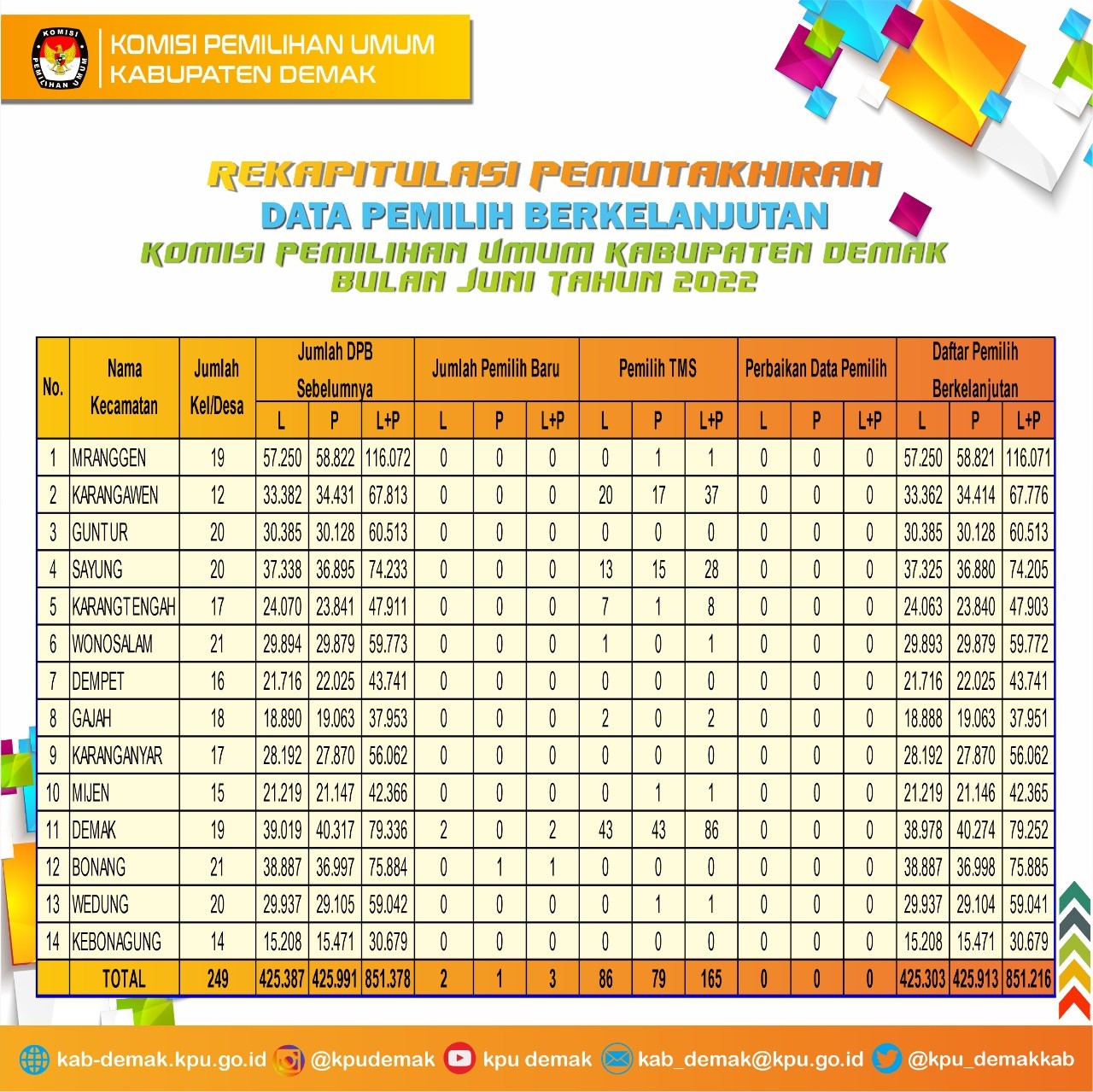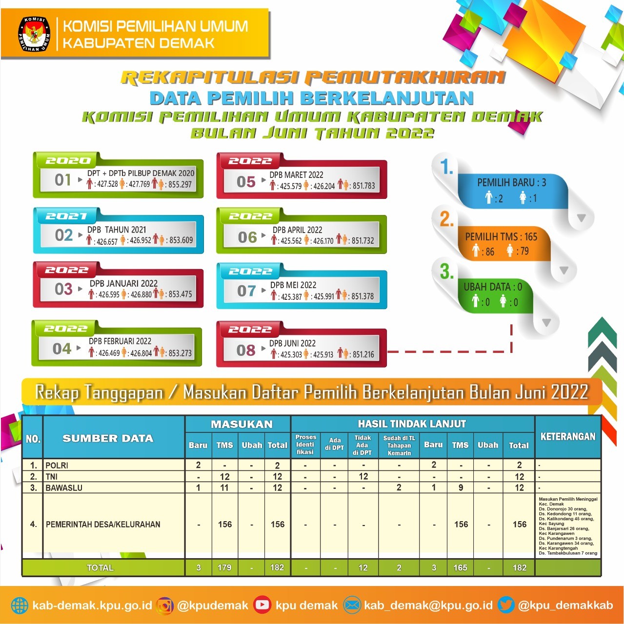 Berikut infografik Rekapitulasi Pemutakhiran Daftar Pemilih Berkelanjutan (DPB) Periode Bulan Juni 2022 di Kabupaten Demak: