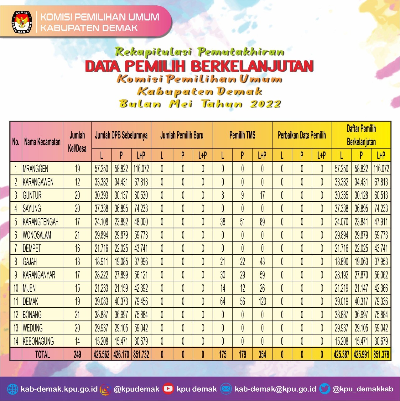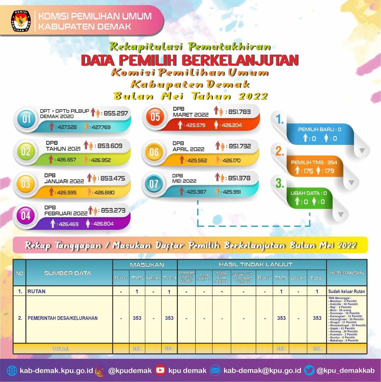 Berikut infografik Rekapitulasi Pemutakhiran Daftar Pemilih Berkelanjutan (DPB) Periode Bulan Maret 2022 di Kabupaten Demak.