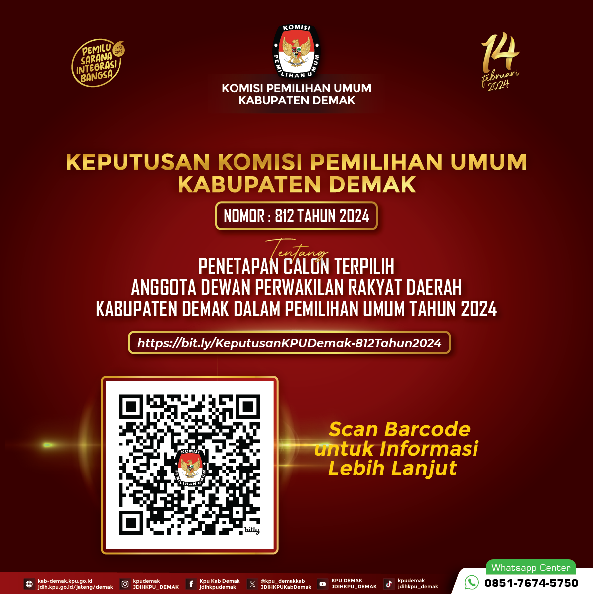Keputusan KPU Kabupaten Demak Nomor 812 Tahun 2024 Tentang Penetapan Perolehan Kursi Anggota DPRD Kabupaten Demak dalam Pemilihan Umum Tahun 2024 dibawah ini: