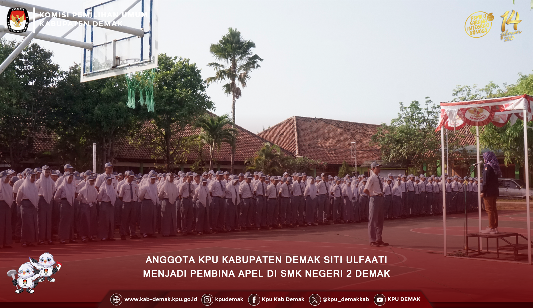 Demak, kab-demak.kpu.go.id – Anggota KPU Kabupaten Demak Divisi Sosdiklih, Parmas dan SDM Siti Ulfaati, M.S.I menjadi pembina Apel di Sekolah Menengah Kejuruan Negeri (SMKN) 2 Demak. Sebanyak 1.256 siswa-siswi menjadi sasaran sosialisasi Pemilihan Umum Serentak tahun 2024. (03/10/2023)
