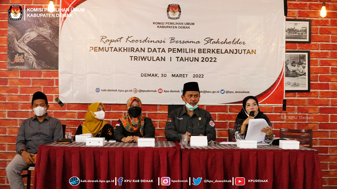 Demak, kab-demak.kpu.go.id – KPU Kabupaten Demak melaksanakan Rapat Koordinasi dengan Stakeholder terkait Pemutakhiran Data Pemilih Berkelanjutan (PDPB) pada Rabu (30/03/2022). Selain mengimplementasikan PKPU Nomor 6 Tahun 2021, rapat koordinasi ini juga sebagai forum dan media untuk menumbuhkan iklim gotong royong dalam penyusunan daftar pemilih. Penyusunan daftar pemilih tidak hanya menjadi tugas KPU tetapi semua elemen dan stakeholder sama-sama berkwajiban ikut menyusun daftar pemilih. Rapat koordinasi ini adalah rapat yang sifatnya rutinitas dalam setiap triwulan dan kali ini adalah rapat koordinasi tepatnya triwulan pertama di tahun 2022.