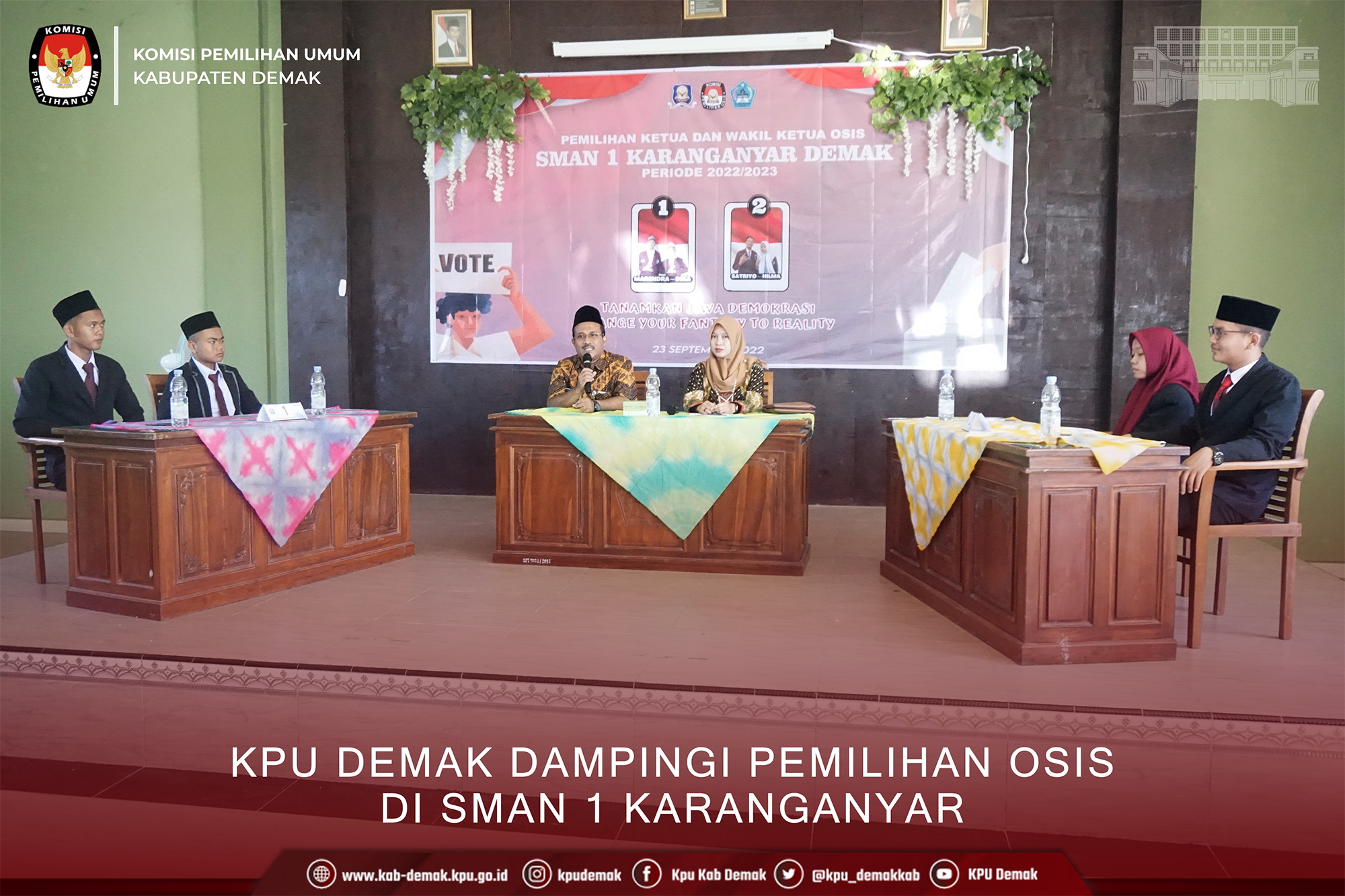 Demak, kab-demak.kpu.go.id – Anggota KPU Kabupaten Demak Divisi Sosialisasi, Pendidikan Pemilih, Partisipasi Masyarakat dan SDM, Siti Ulfaati menghadiri dan menjadi narasumber dalam acara Pemilihan Ketua dan Wakil Ketua Osis SMAN 1 Karanganyar, Demak. (Jumat, 23/9/2022)