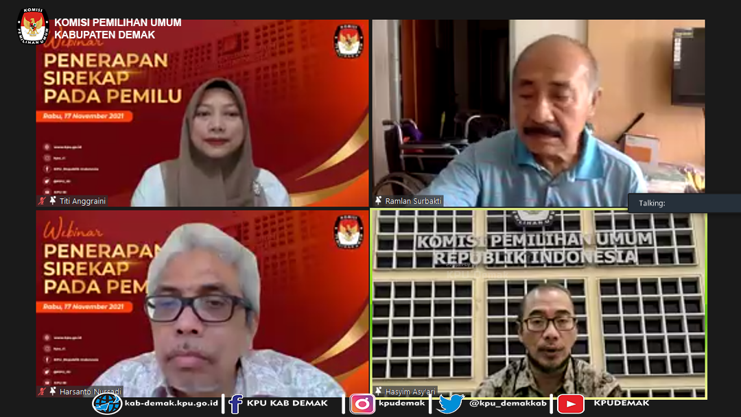 Demak, kab-demak.kpu.go.id – KPU Kabupaten Demak mengikuti Webinar Penerapan Sirekap pada Pemilu, hari ini (17/11). Kegiatan yang diselenggarakan KPU RI secara daring tersebut dibuka oleh Ketua KPU RI, Ilham Saputra. Sebagai Pengantar, Anggota KPU RI Divisi Teknis, Evi Novida Ginting, dan narasumber berasal dari Pakar Hukum Administrasi Negara Dr. Harsanto Nursadi, S.H., M.Si dan Pakar Kepemiluan Prof. Ramlan Surbakti, MA., PH.D . Acara diikuti Ketua dan Anggota KPU Provinsi dan Kabupaten/Kota; Kabag Hukum Teknis dan Hupmas; dan Kasubbag Teknis dan Hupmas di seluruh Indonesia.