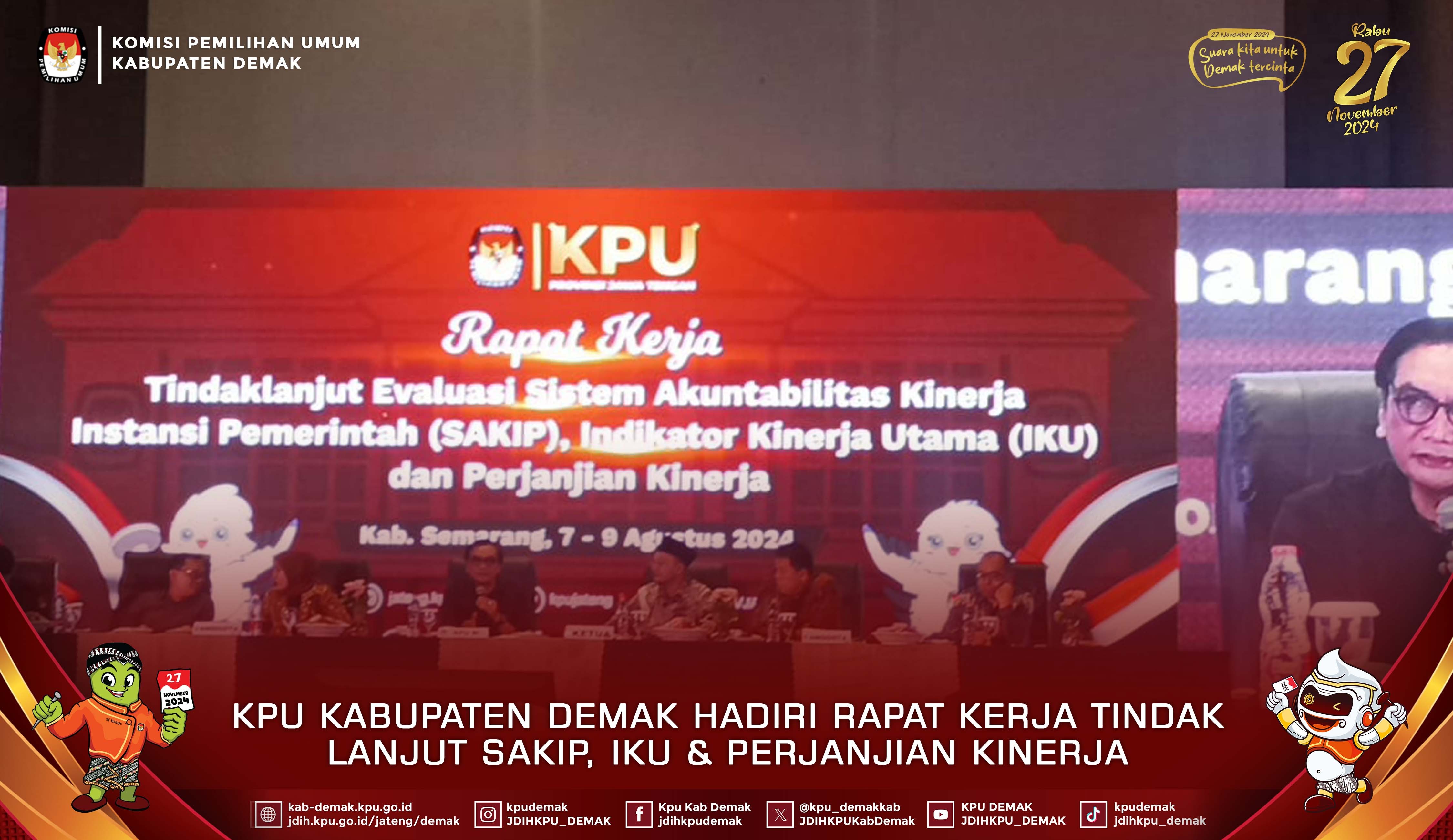 Demak, kab-demak.kpu.go.id - Ketua, Kadiv Perencanaan, Data, dan Informasi (Rendatin) serta Kasubbag Rendatin dan operator Sidalih menghadiri Rapat Kerja Tindak Lanjut Evaluasi Sistem Akuntabilitas Kinerja Instansi Pemerintah (SAKIP), Indikator Kinerja Utama (IKU) dan Perjanjian Kinerja di Hotel Wujil Kabupaten Semarang. (Rabu, 7/8/2024)