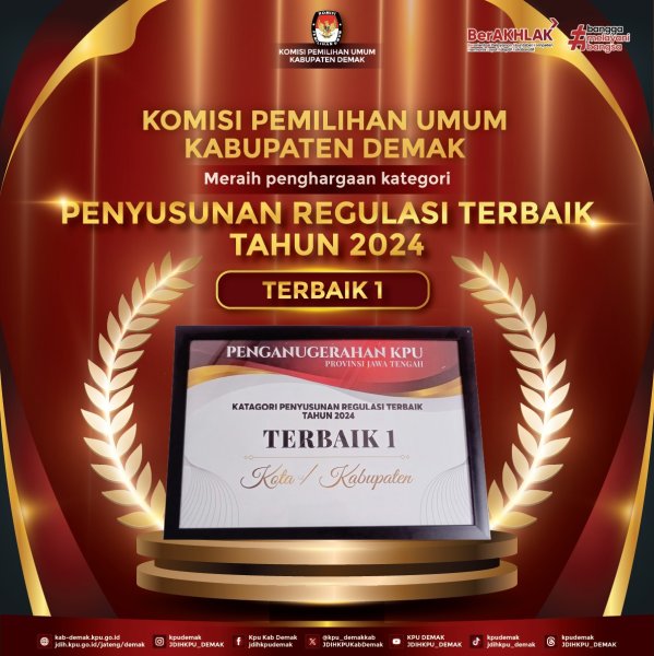 Demak, kab-demak.kpu.go.id - KPU Kabupaten Demak mendapatkan Penghargaan dari KPU Provinsi Jawa Tengah dengan Kategori Penyusunan Regulasi Terbaik I Tahun 2024.