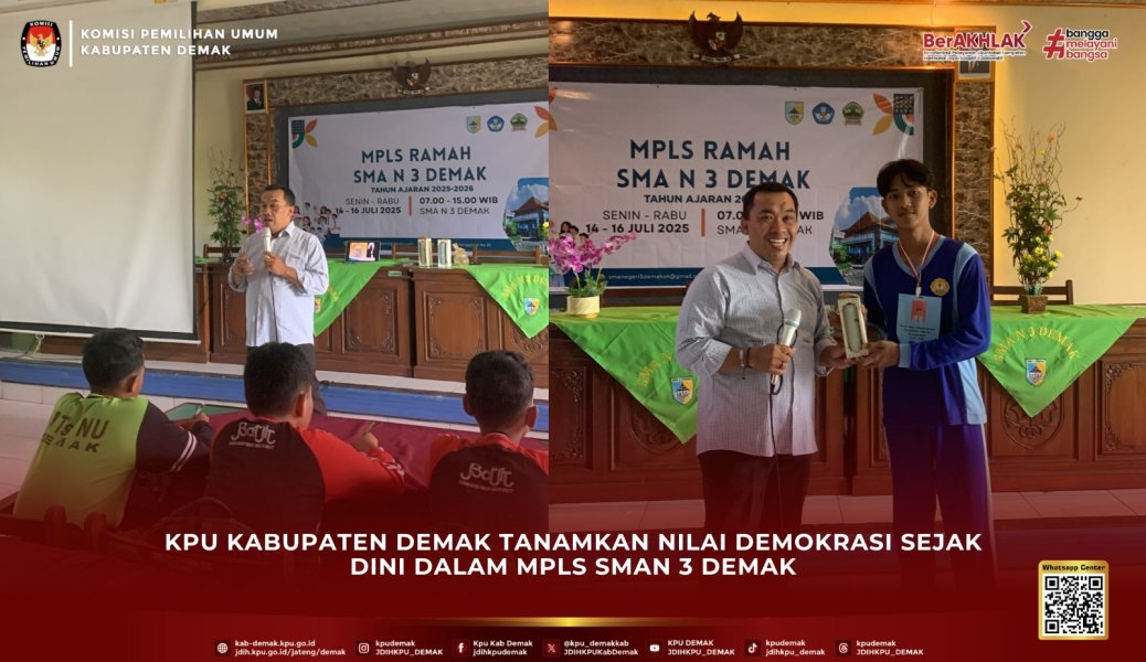 KPU KABUPATEN DEMAK TANAMKAN NILAI DEMOKRASI SEJAK DINI DALAM MPLS SMAN 3 DEMAK