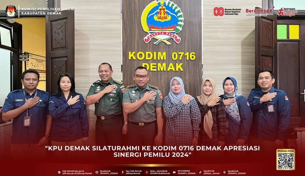 Sebagai bentuk apresiasi, KPU Kabupaten Demak berkunjung ke Kodim 0716/Demak. Kunjungan ini menjadi momentum mempererat hubungan kelembagaan sekaligus menyampaikan penghargaan atas kontribusi TNI, khususnya Dandim 0716/Demak Letkol Arm Dony Romansah, S.Sos., M.Han, dalam mengawal kelancaran Pemilu 2024.