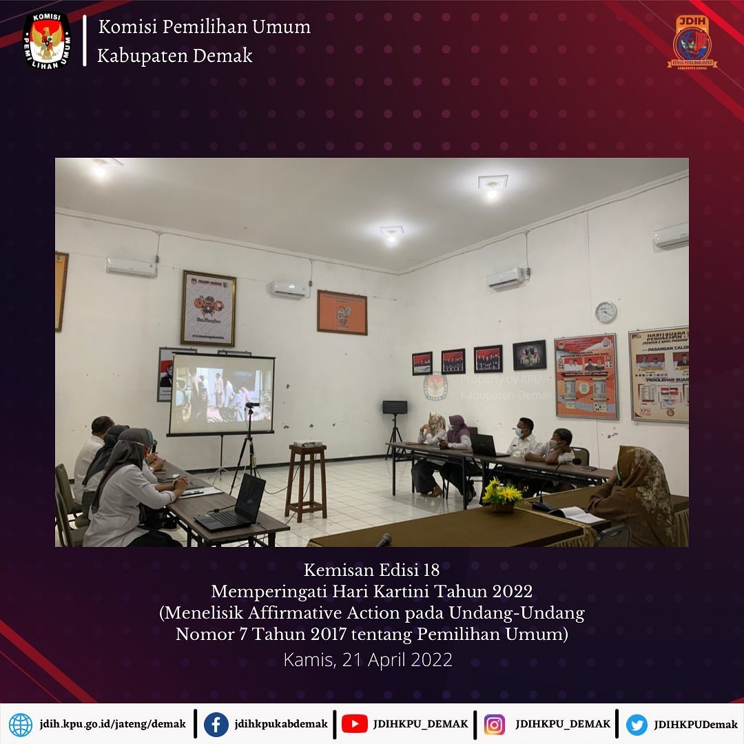 Menelisik pasal Affirmative Action pada Undang-Undang tentang Pemilu. Ya. Itulah cara yang dilakukan KPU Kabupaten Demak dalam memperingati Hari Kartini di Tahun 2022 ini. Kegiatan yang dikemas dalam kajian regulasi “Kemisan” tersebut dilaksanakan hari ini (21/4), bertempat di Aula KPU Kabupaten Demak. Sebagai pembicara pada kegiatan tersebut adalah Anggota KPU Kabupaten Demak Hastin Atas Asih. Acara diikuti oleh segenap pejabat struktural, fungsional dan staf sekretariat KPU Kabupaten Demak.