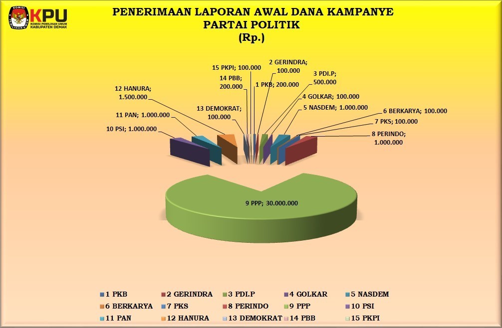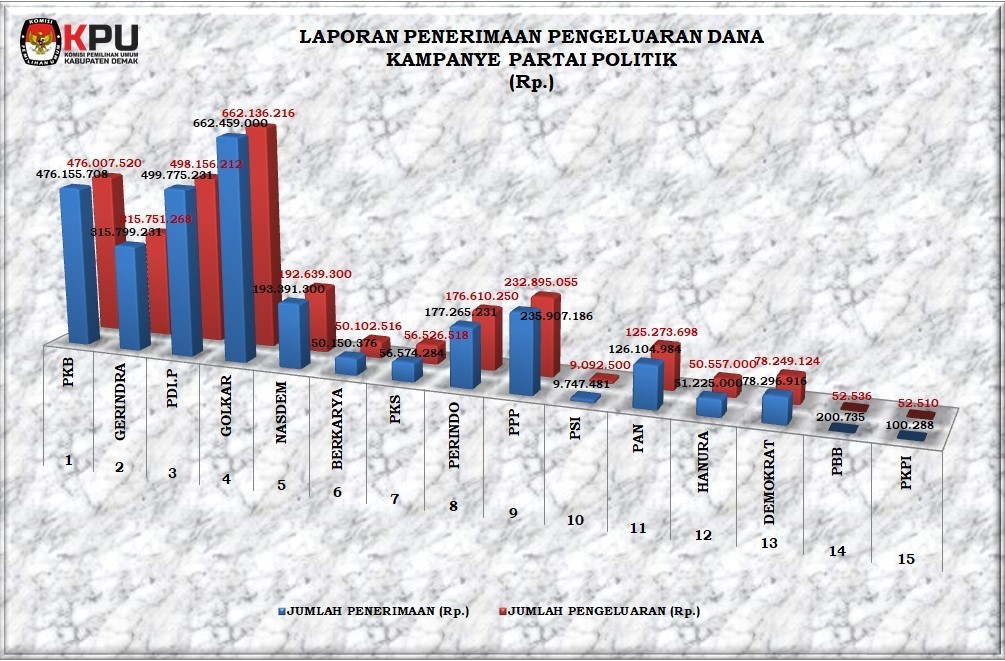 Berikut laporan penerimaan dan pengeluaran dana kampanye partai politik pada Laporan Penerimaan dan Pengeluaran Dana Kampanye pemilu 2019 di Kabupaten Demak: