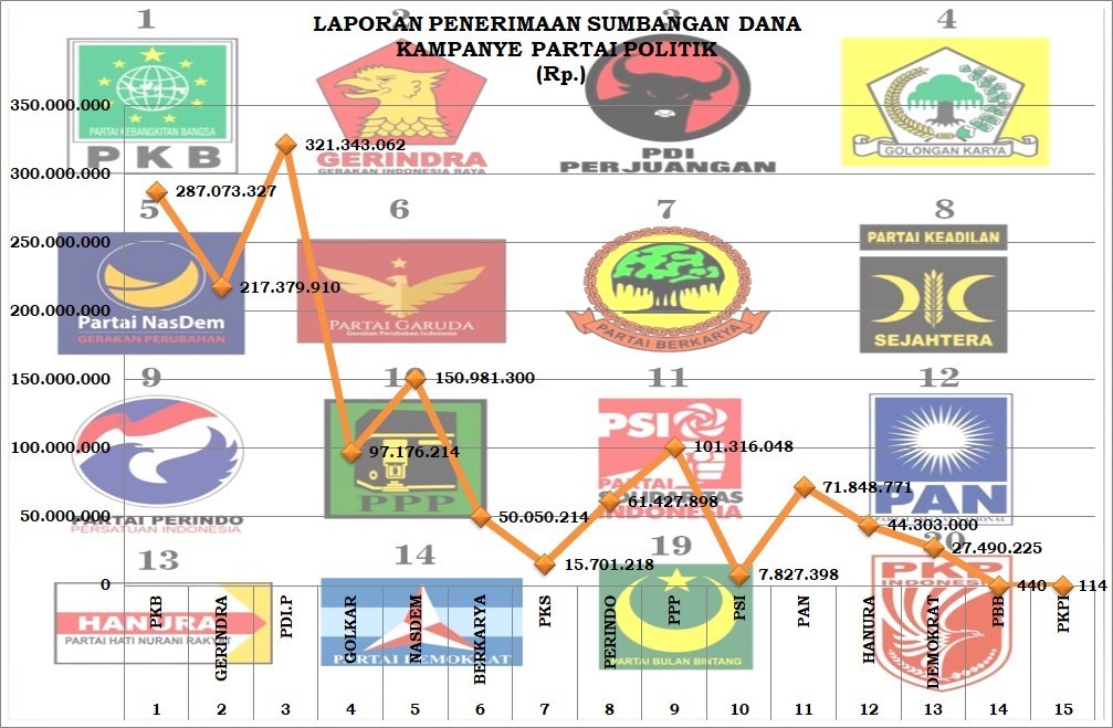 Berkaitan dengan jumlah sumbangan dana kampanye misalnya, jelas terlihat tidak ada yang melebihi batasan maksimal. Pada Laporan Awal Dana Kampanye (LADK), saldo terbesar hanya 30 juta rupiah. Sedangkan terendah adalah 100 ribu rupiah. Rata-rata yang lainnya adalah 1 juta rupiah. Sedangkan untuk saldo tim kampanye pasangan calon presiden dan wakil presiden, bahkan ada yang nol. Artinya di tahap awal, dana kampanye yang diterima masih sangat minim, atau bahkan hanya untuk membuka rekening khusus dana kampanye. Untuk penerimaan laporan awal dana kampanye parpol dan calon presiden dan wakil presiden adalah sebagai berikut: