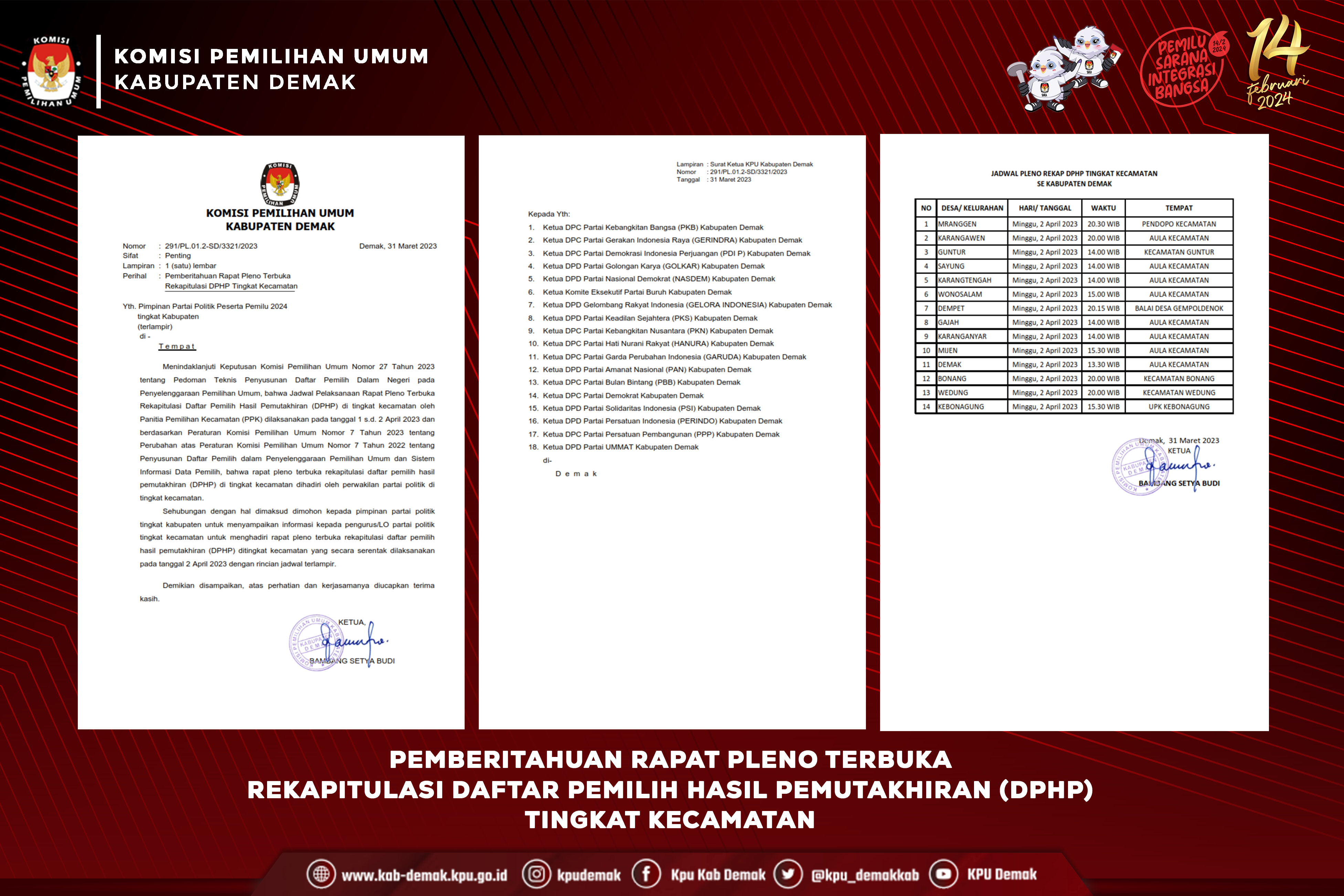 #TemanPemilih, berikut pemberitahuan kepada LO/Pengurus Partai Politik di tingkat Kecamatan di Kabupaten Demak untuk menghadiri Rapat Pleno Terbuka Rekapitulasi Daftar Pemilih Hasil Pemutakhiran (DPHP) di Tingkat Kecamatan. Rapat Pleno dilaksanakan secara serentak pada Minggu, 2 April 2023. Unduh pemberitahuan di bawah untuk mengetahui informasi lebih lanjut.