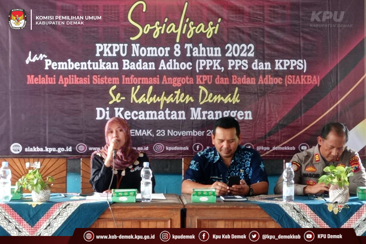 Komisi Pemilihan Umum (KPU) Kabupaten Demak melakukan sosialisasi secara masif terkait pembentukan Badan Adhoc di 14 Kecamatan se-Kabupaten Demak mulai tanggal 21 November sampai 23 November. Hal tersebut dilakukan untuk menyebaruaskan informasi terkait pembentukan Badan Adhoc menggunakan aplikasi Sistem Informasi Anggota KPU dan Badan Adhoc (SIAKBA). Adapun PPK yang dibutuhkan adalah sebanyak 70 orang dengan jumlah masing-masing 5 orang yang tersebar di 14 kecamatan.