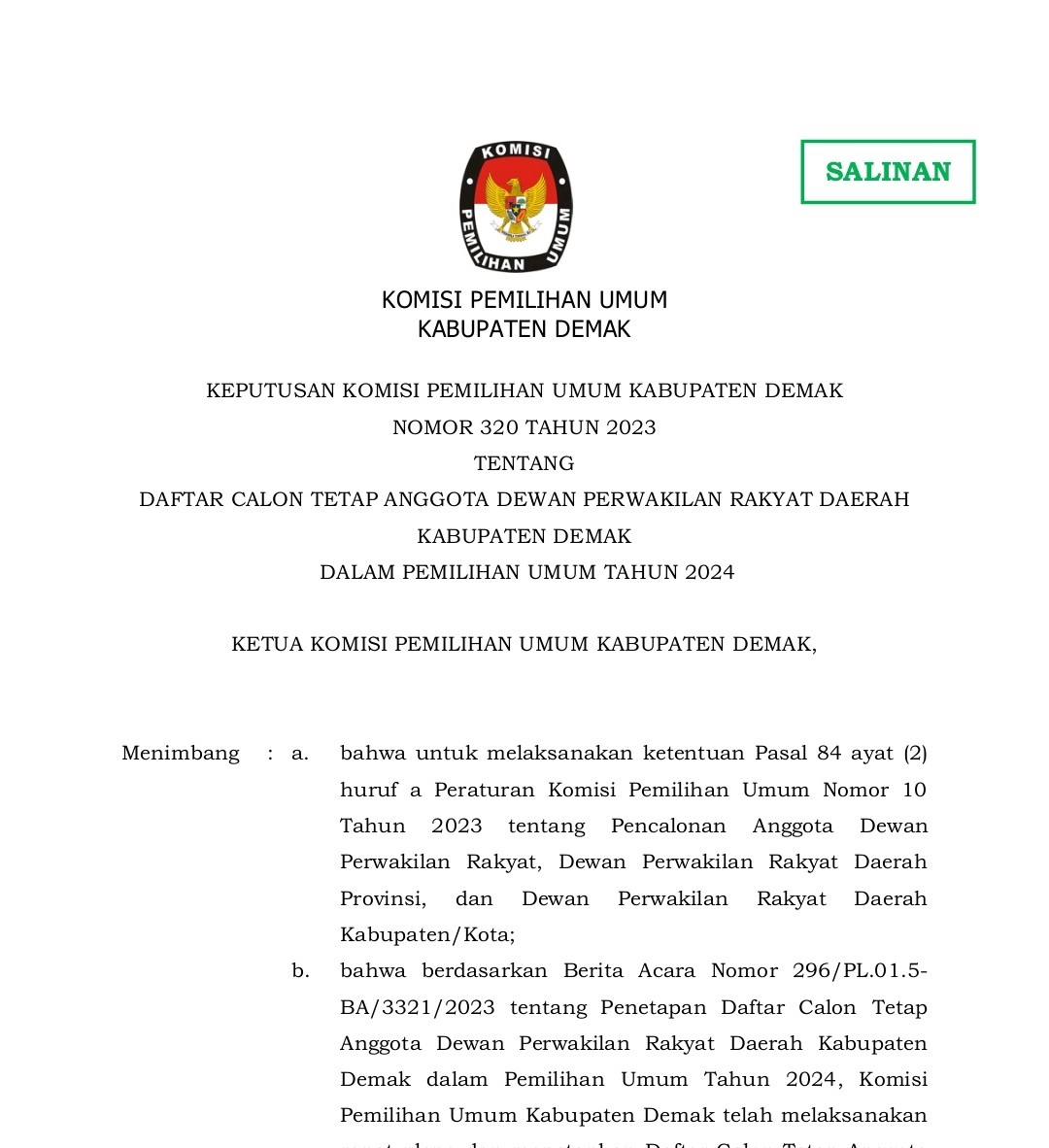 2 | Keputusan KPU Kabupaten Demak Nomor 320 Tahun 2023 tentang Daftar Calon Tetap (DCT) Anggota DPRD Kabupaten Demak dalam Pemilu Tahun 2024 | Unduh |