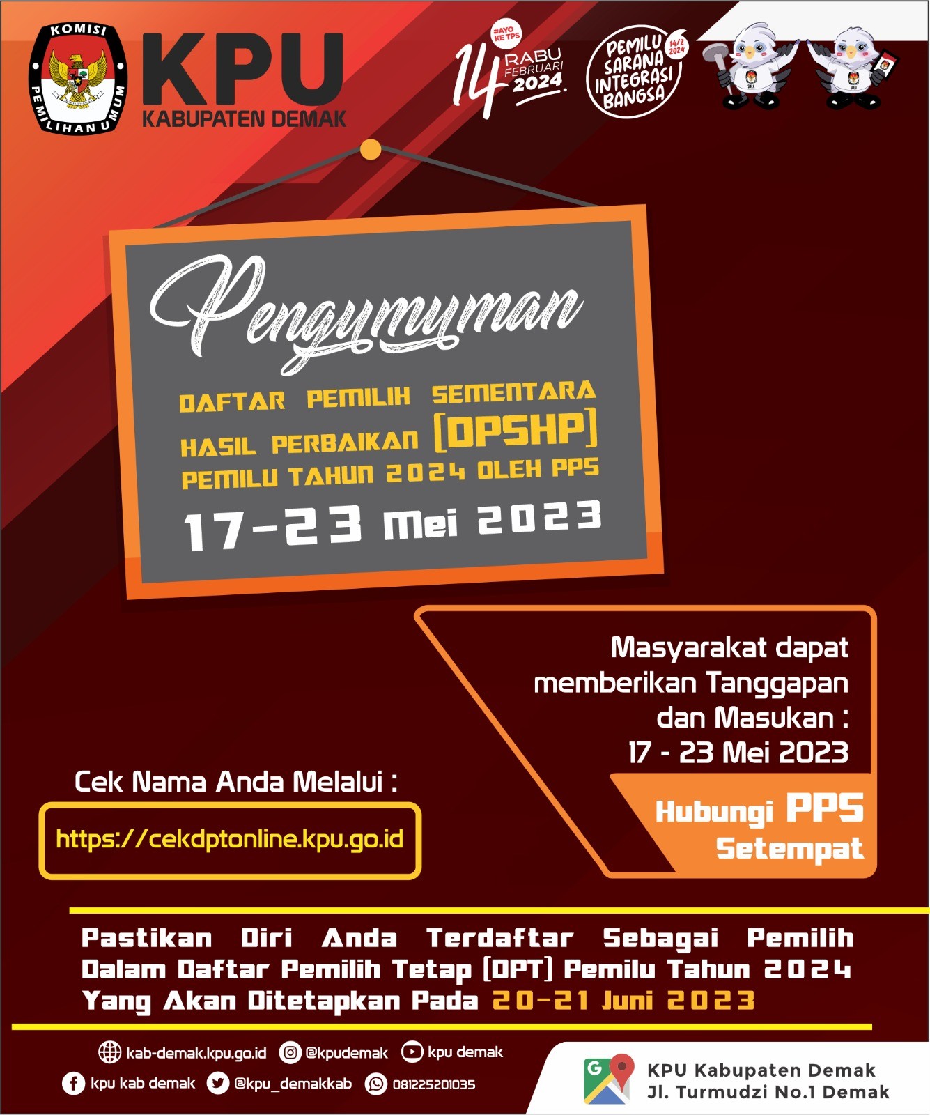 Cek Pengumuman DPSHP oleh PPS setempat atau cek melalui https://cekdptonline.kpu.go.id/. Selain itu, Anda juga dapat memberikan tanggapan dan masukan kepada PPS setempat mulai tanggal 17 Mei 2023 sampai dengan 23 Mei 2023.