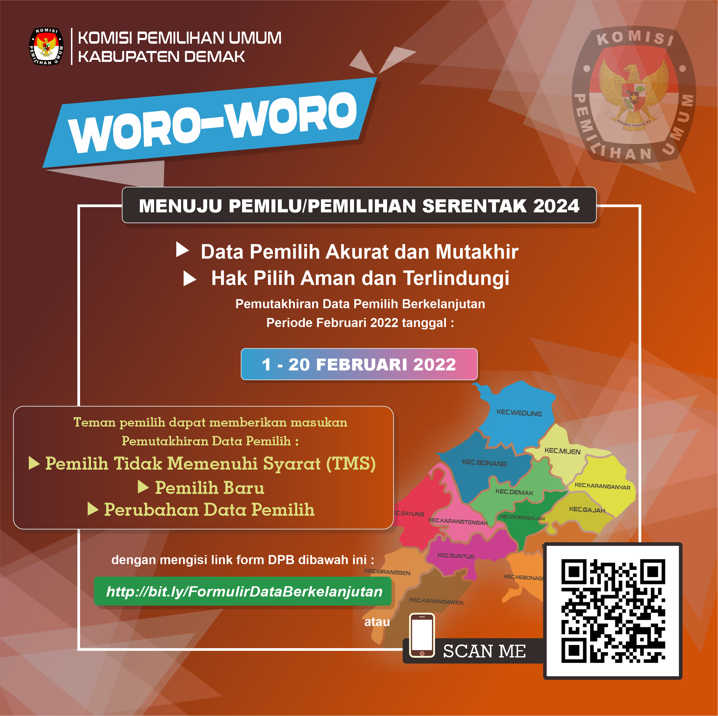 Ayo ikut serta dalam Pemutakhiran Data Pemilih Berkelanjutan Periode Februari 2022 di Kabupaten Demak dengan memberikan masukan data melalui tautan https://bit.ly/FormulirDataBerkelanjutan atau scan barcode pada gambar di bawah ini.