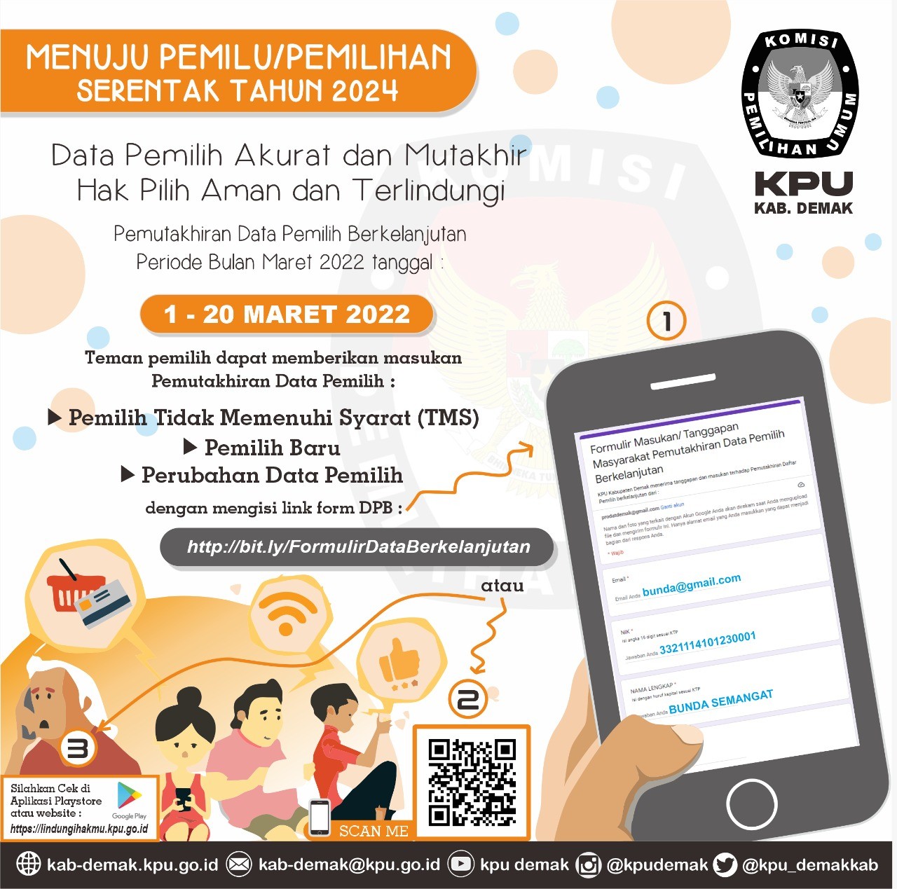 Ayo ikut serta dalam Pemutakhiran Data Pemilih Berkelanjutan Periode Maret 2022 di Kabupaten Demak dengan memberikan masukan data melalui tautan https://bit.ly/FormulirDataBerkelanjutan atau scan barcode pada gambar di bawah ini.