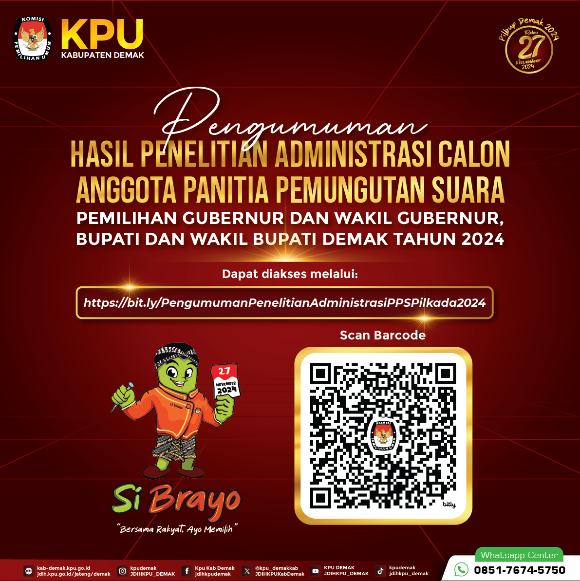 PENGUMUMAN HASIL PENELITIAN ADMINISTRASI CALON ANGGOTA PPS UNTUK PEMILIHAN GUBERNUR DAN WAKIL GUBERNUR, DAN BUPATI DAN WAKIL BUPATI PADA KABUPATEN DEMAK TAHUN 2024