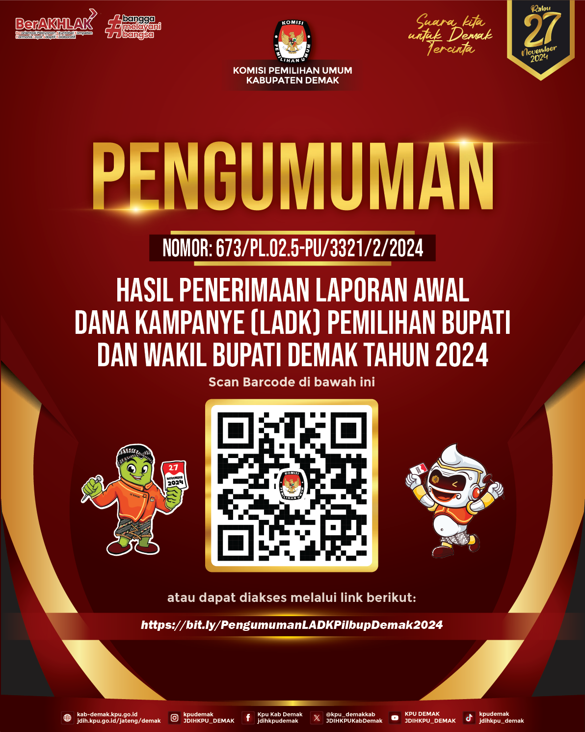 PENGUMUMAN HASIL PENERIMAAN LAPORAN AWAL DANA KAMPANYE (LADK) PEMILIHAN BUPATI DAN WAKIL BUPATI DEMAK TAHUN 2024