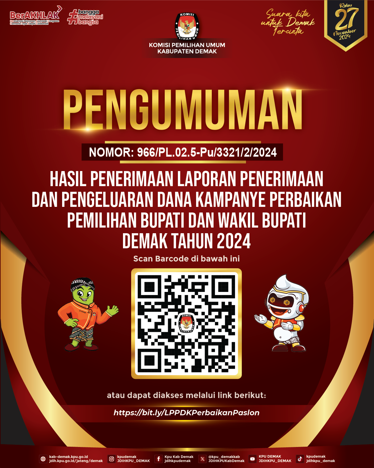 Pengumuman KPU Kabupaten Demak Nomor: 962/PL.02.5-Pu/3321/2/2O24 Tentang Pengumuman Hasil Penerimaan Laporan Penerimaan dan Pengeluaran Dana Kampanye Perbaikan Pemilihan Bupati dan Wakil Bupati Demak Tahun 2024 dibawah ini: