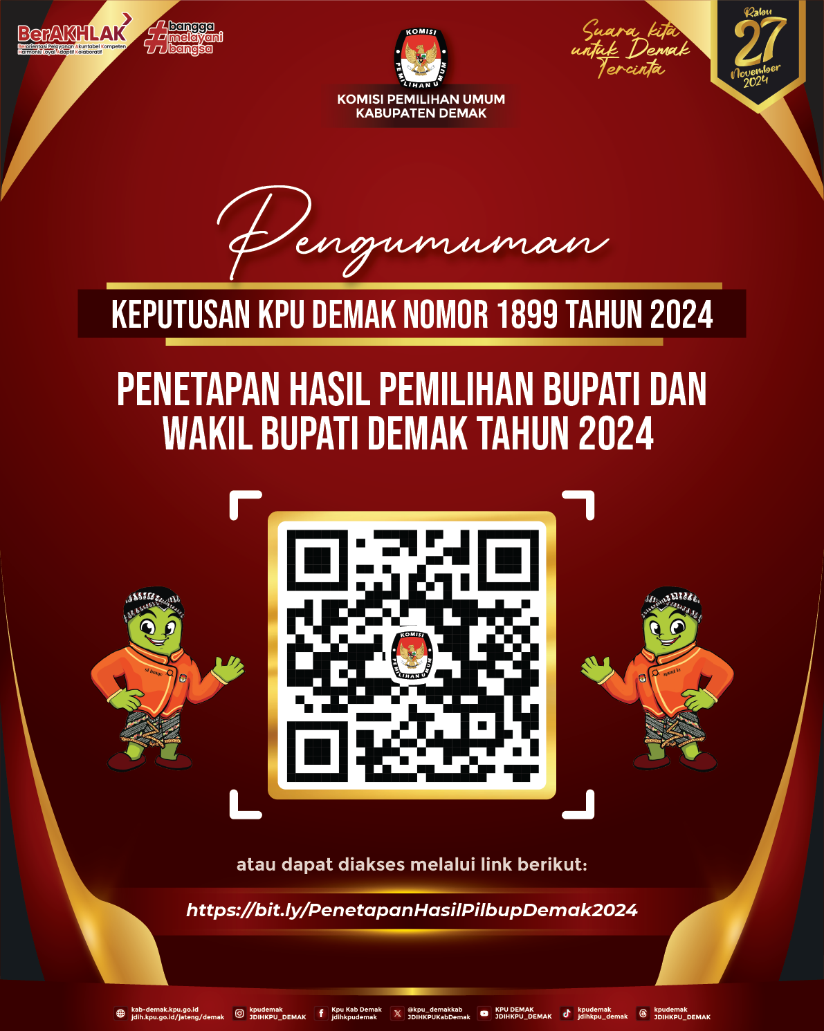 Pengumuman Keputusan KPU Kabupaten Demak Nomor 1899 Tahun 2024 Tentang Penetapan Hasil Pemilihan Bupati dan Wakil Bupati Demak Tahun 2024 |