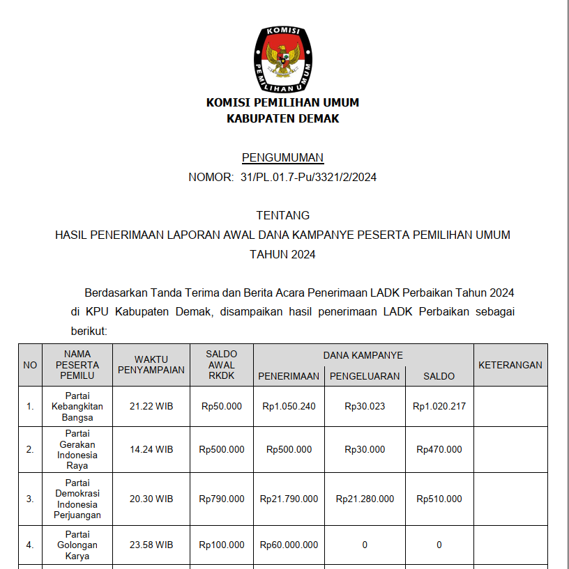 KPU Kabupaten Demak Mengumumkan Laporan Awal Dana Kampanye (LADK) Partai Politik Peserta Pemilu Tahun 2024 se-Kabupaten Demak dibawah ini: