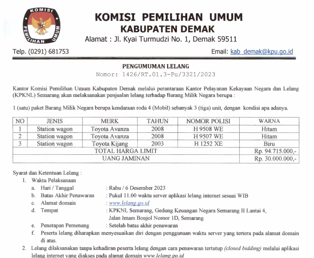 PENGUMUMAN LELANG BMN MOBIL KPU KABUPATEN DEMAK Rabu, 29 November 2023 10:03 83 PENGUMUMAN LELANG BMN MOBIL KPU KABUPATEN DEMAK DAPAT UNDUH DISINI Bagikan: Dilihat 83 Kali.