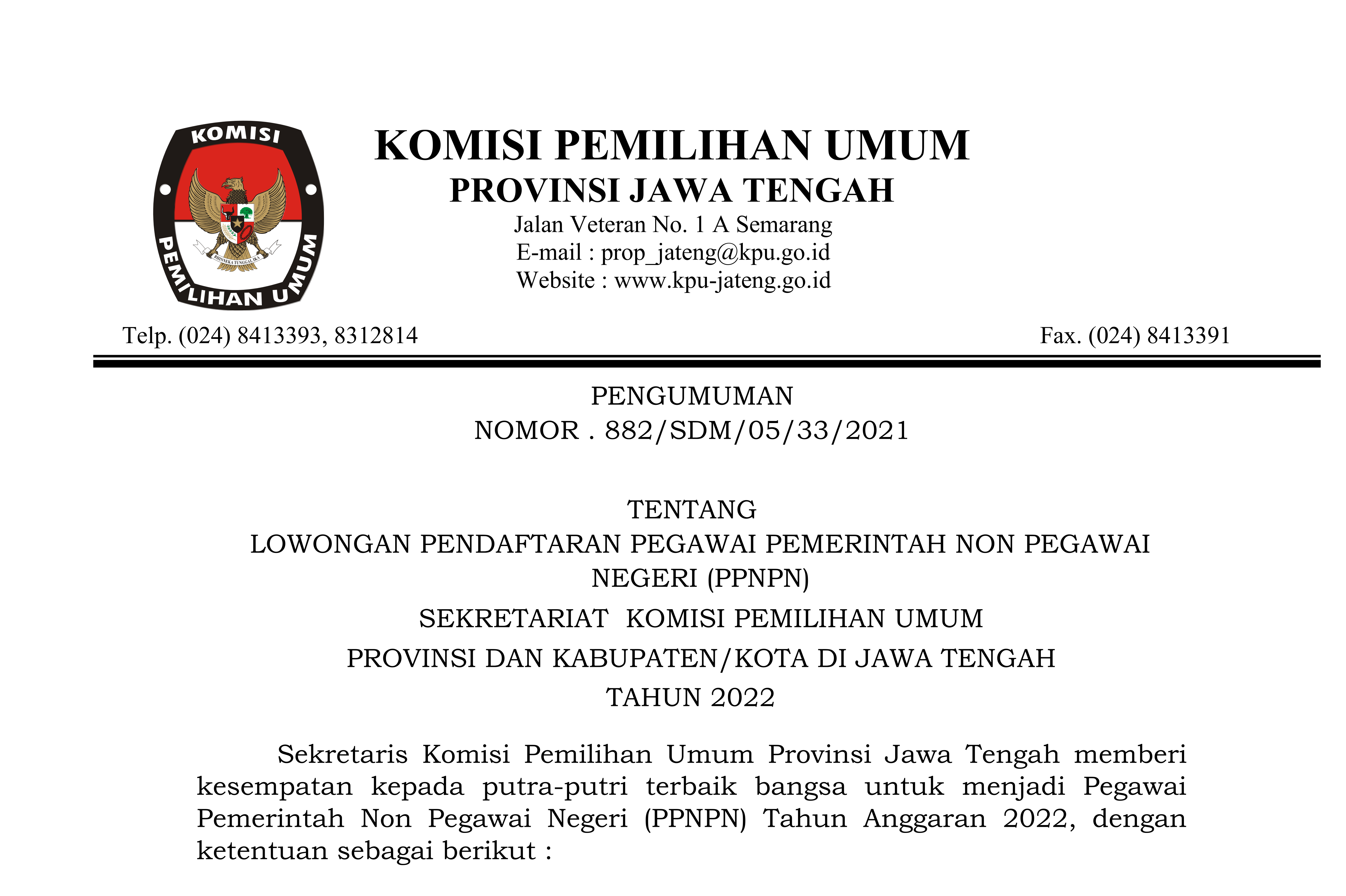 Komisi Pemilhan Umum Provinsi Jawa Tengah membuka lowongan pendaftaran Pegawai Pemerintah Non Pegawai Negeri (PPNPM) pada Sekretariat KPU Provinsi dan Kabupaten/Kota di Jawa Tengah. Informasi selengkapnya, klik tautan di bawah ini: