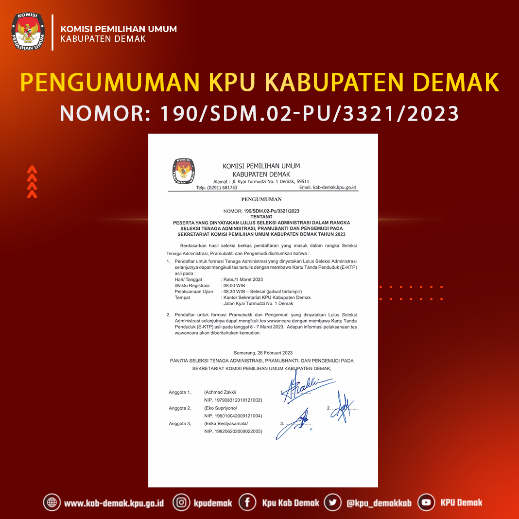 #TemanPemilih, berikut Pengumuman KPU Kabupaten Demak Nomor: 190/SDM.01-Pu/3321/2023 tentang Peserta yang Dinyatakan Lulus Seleksi Administrasi dalam rangka Seleksi Tenaga Administrasi, Pramubakti, dan Pengemudi pada Sekretariat Komisi Pemilihan Umum Kabupaten Demak Tahun 2023.