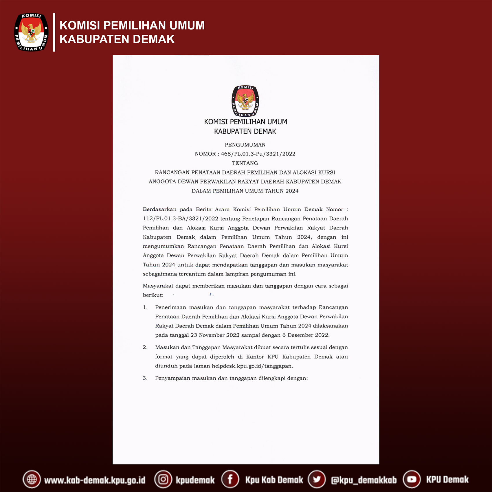 #TemanPemilih, KPU Kabupaten Demak menerbitkan Pengumuman Nomor : 468/Pl.01.3-Pu/3321/2022 tentang Rancangan Penataan Daerah Pemilihan dan Alokasi Kursi Anggota Dewan Perwakilan Rakyat Daerah Kabupaten Demak Dalam Pemilihan Umum Tahun 2024.