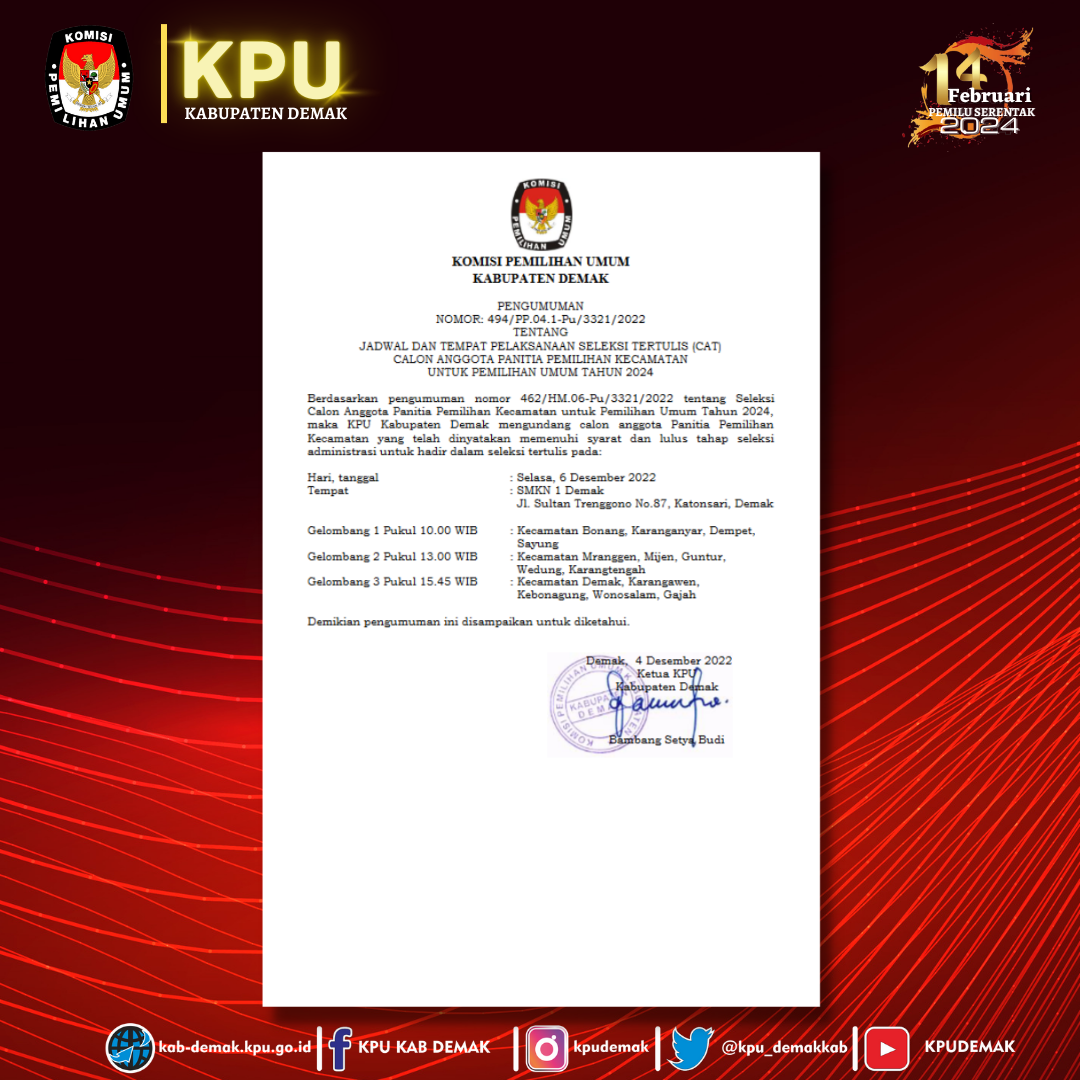 #TemanPemilih, berikut Pengumuman KPU Kabupaten Demak Nomor : 494/PP.04.1-Pu/3321/2022 tentang Jadwal dan Tempat Pelaksanaan Seleksi Tertulis (CAT) Calon Anggota Panitia Pemilihan Kecamatan untuk Pemilihan Umum Tahun 2024.