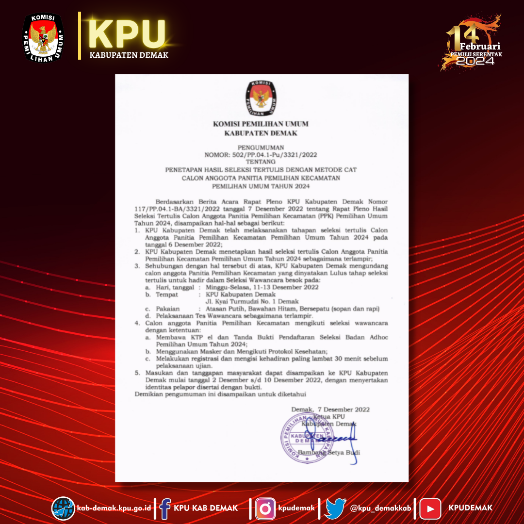 #TemanPemilih, berikut Pengumuman KPU Kabupaten Demak Nomor : 502/PP.04.1-Pu/3321/2022 tentang Penetapan Hasil Seleksi Tertulis dengan Metode CAT Calon Anggota Panitia Pemilihan Kecamatan Pemilihan Umum Tahun 2024.
