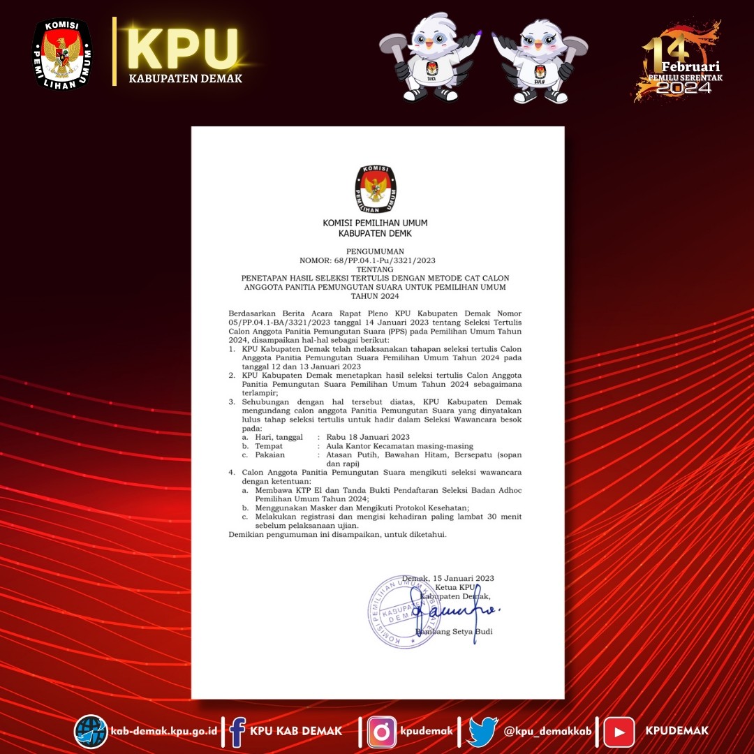 #TemanPemilih, berikut Pengumuman KPU Kabupaten Demak Nomor: 68/PP.04.1-Pu/3321/2023 tentang Penetapan Hasil Seleksi Tertulis dengan Metode CAT Calon Anggota Panitia Pemungutan Suara untuk Pemilihan Umum Tahun 2024.