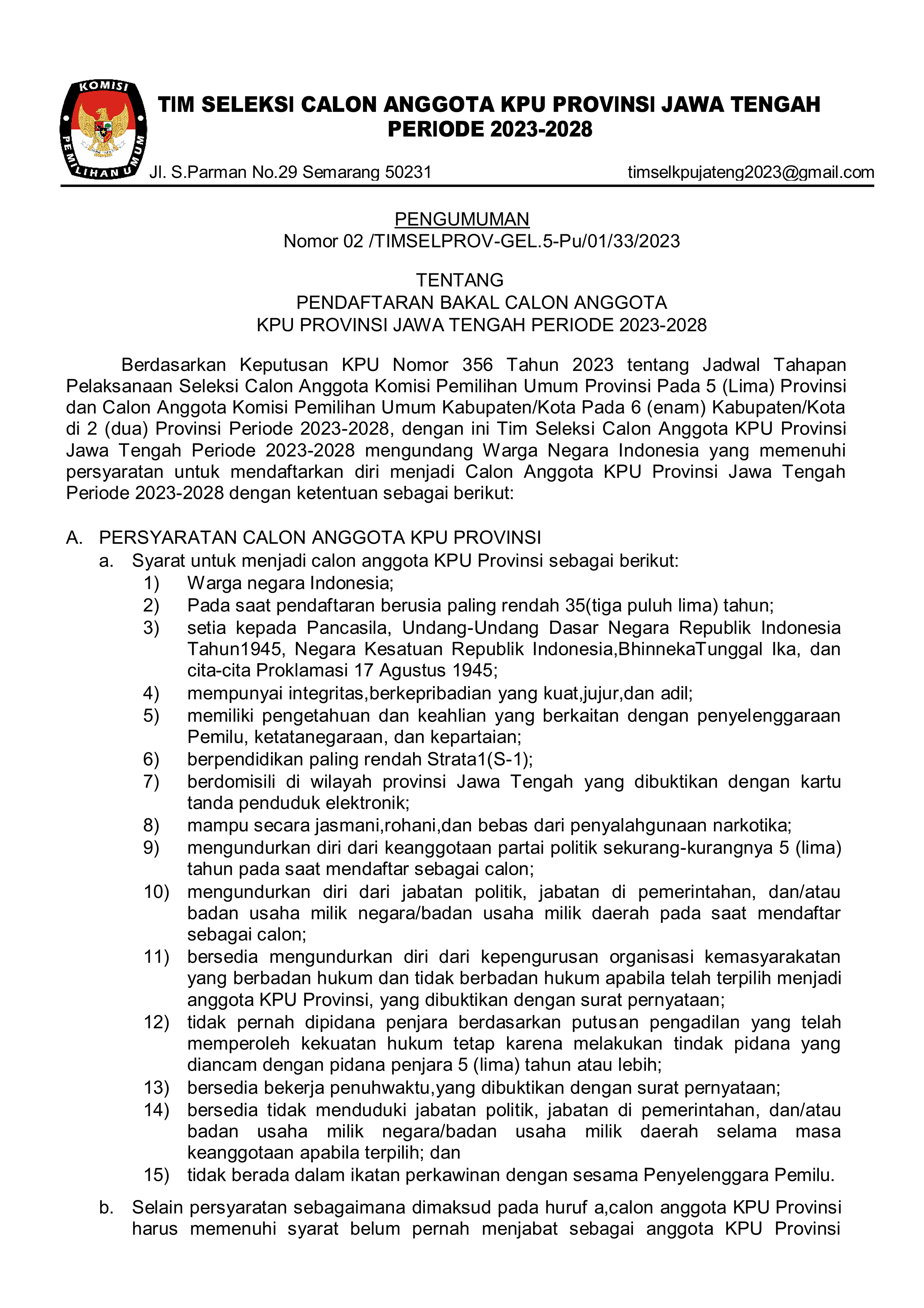 PENGUMUMAN PENDAFTARAN BAKAL CALON ANGGOTA KPU PROVINSI JAWA TENGAH PERIODE 2023-2028