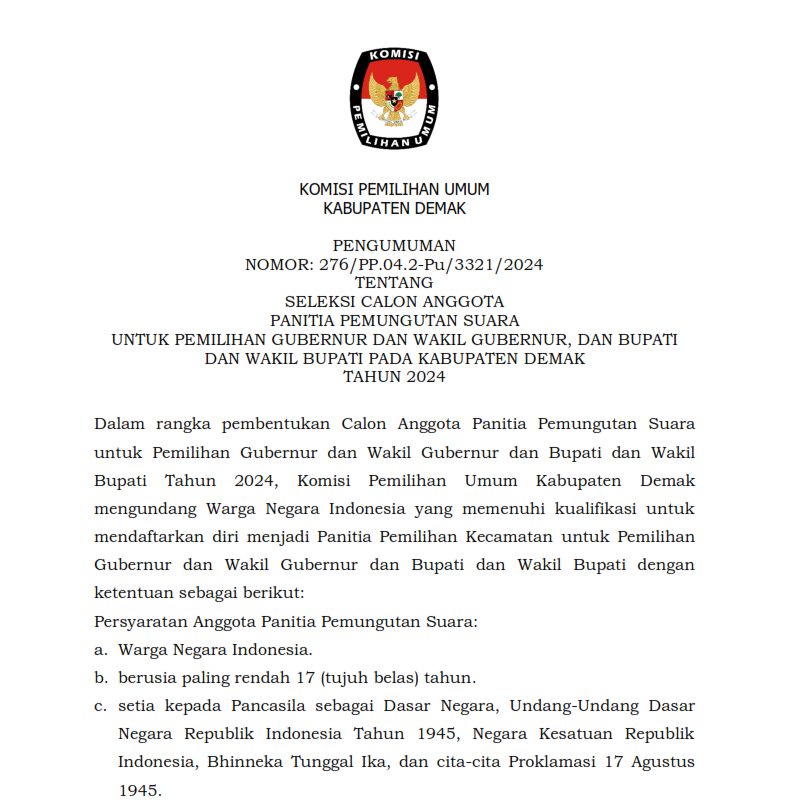 PENGUMUMAN PENDAFTARAN CALON ANGGOTA PPS UNTUK PEMILIHAN GUBERNUR DAN WAKIL GUBERNUR, DAN BUPATI DAN WAKIL BUPATI PADA KABUPATEN DEMAK TAHUN 2024