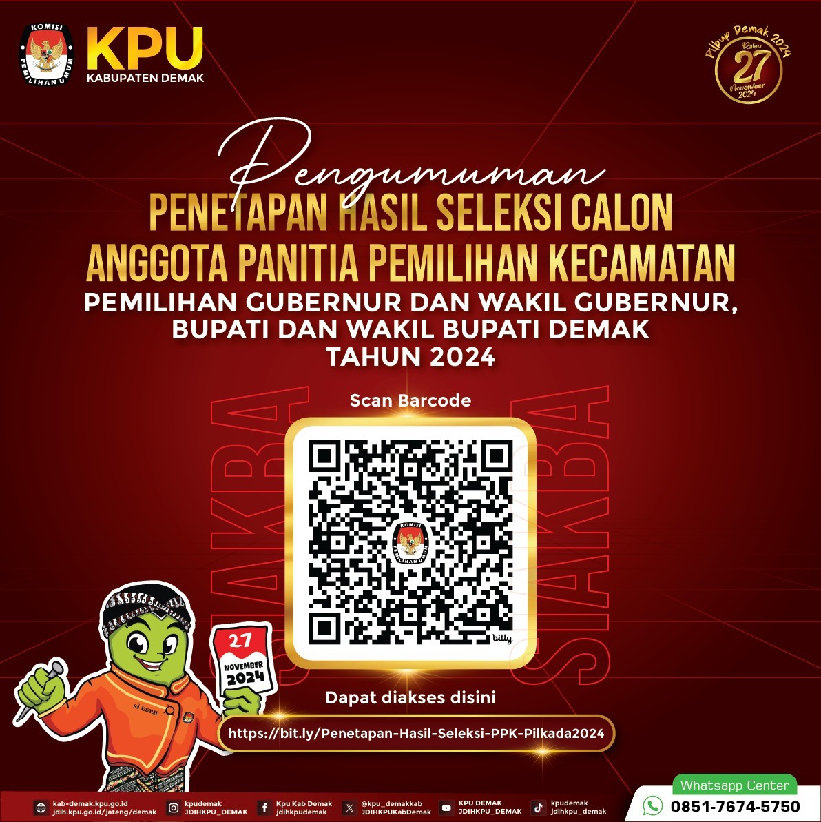 PENGUMUMAN PENETAPAN HASIL SELEKSI CALON ANGGOTA PPK UNTUK PEMILIHAN GUBERNUR DAN WAKIL GUBERNUR, DAN BUPATI DAN WAKIL BUPATI PADA KABUPATEN DEMAK TAHUN 2024