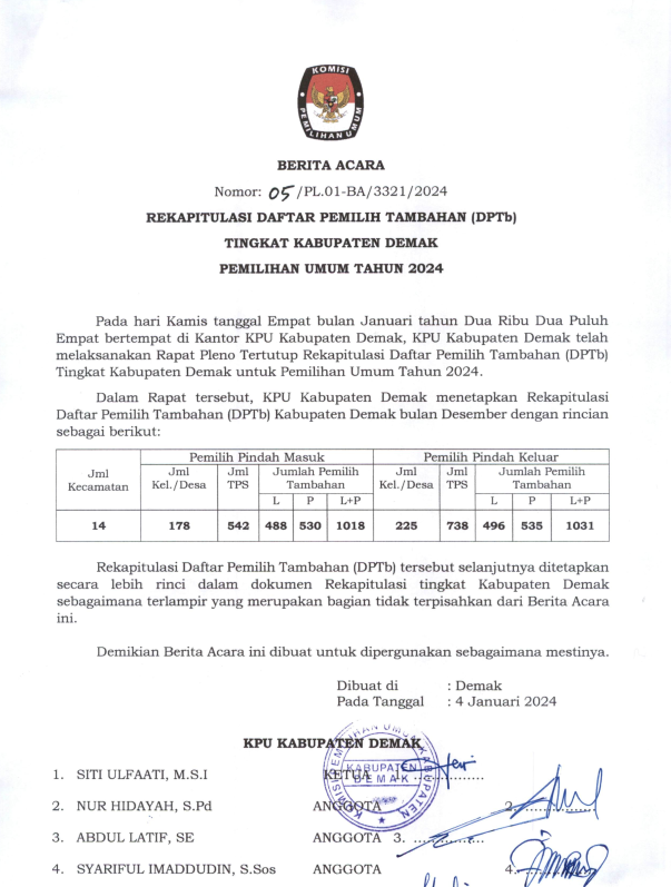 KPU Kabupaten Demak Mengumumkan Rekapitulasi Daftar Pemilih Tambahan (Dptb) Tingkat Kabupaten Demak Pemilihan Umum Tahun 2024 dibawah ini: