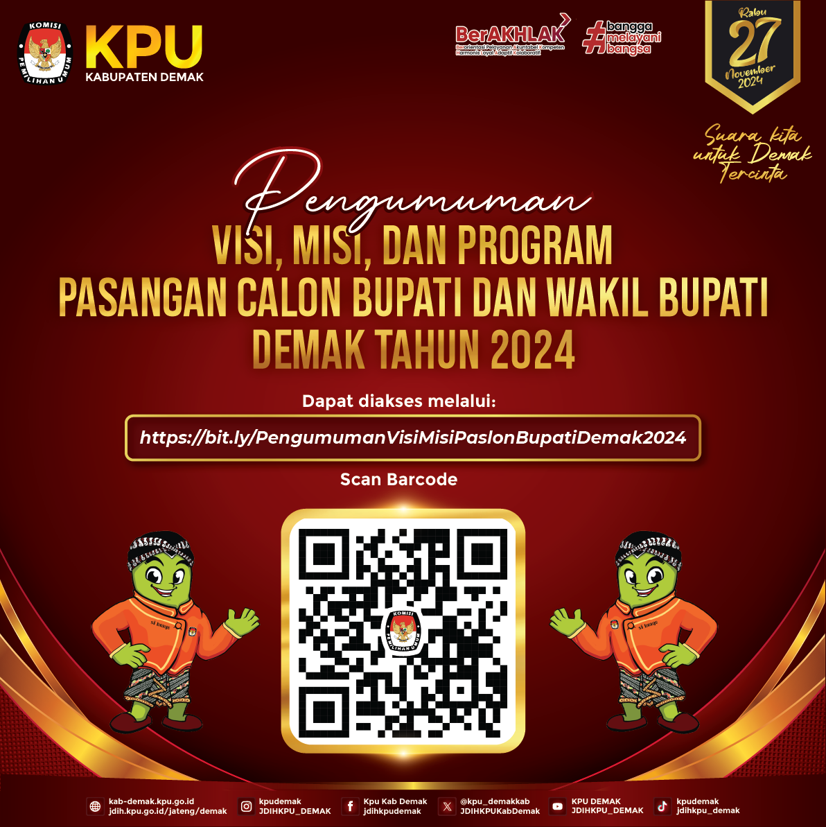 Pengumuman KPU Kabupaten Demak Visi, Misi, dan Program Paslon Bupati dan Wakil Bupati Demak Tahun 2024 dibawah ini: