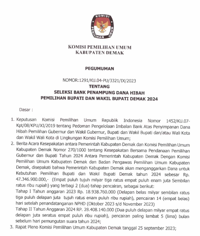 PENGUMUNAN SELEKSI BANK PENAMPUNG DAN HIBAH PEMILIHAN BUPATI DAN WAKIL BUPATI DEMAK 2024 DAPAT UNDUH DISINI