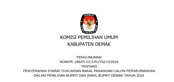 KPU Kabupaten Demak mengumumkan Pengumuman Nomor: 286/PL.02.2-Pu/3321/2/2024 tentang Penyerahan Syarat Dukungan Bakal Pasangan Calon Perseorangan dalam Pemilihan Bupati dan Wakil Bupati Demak Tahun 2024.