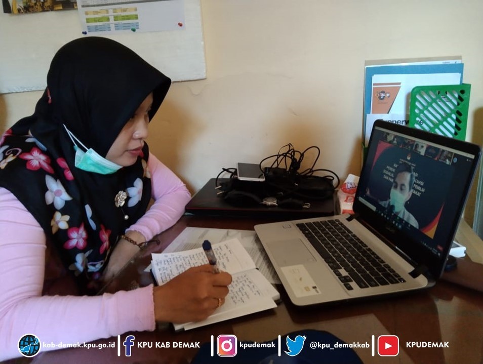 Siti Ulfaati, Anggota KPU Kabupaten Demak Divisi Sosdiklih, Parmas, dan SDM selaku peserta dalam rapat tersebut berkesempatan menyampaikan sharing terkait program-program sosialisasi yang dilaksanakan selama Pilbup Demak 2020.