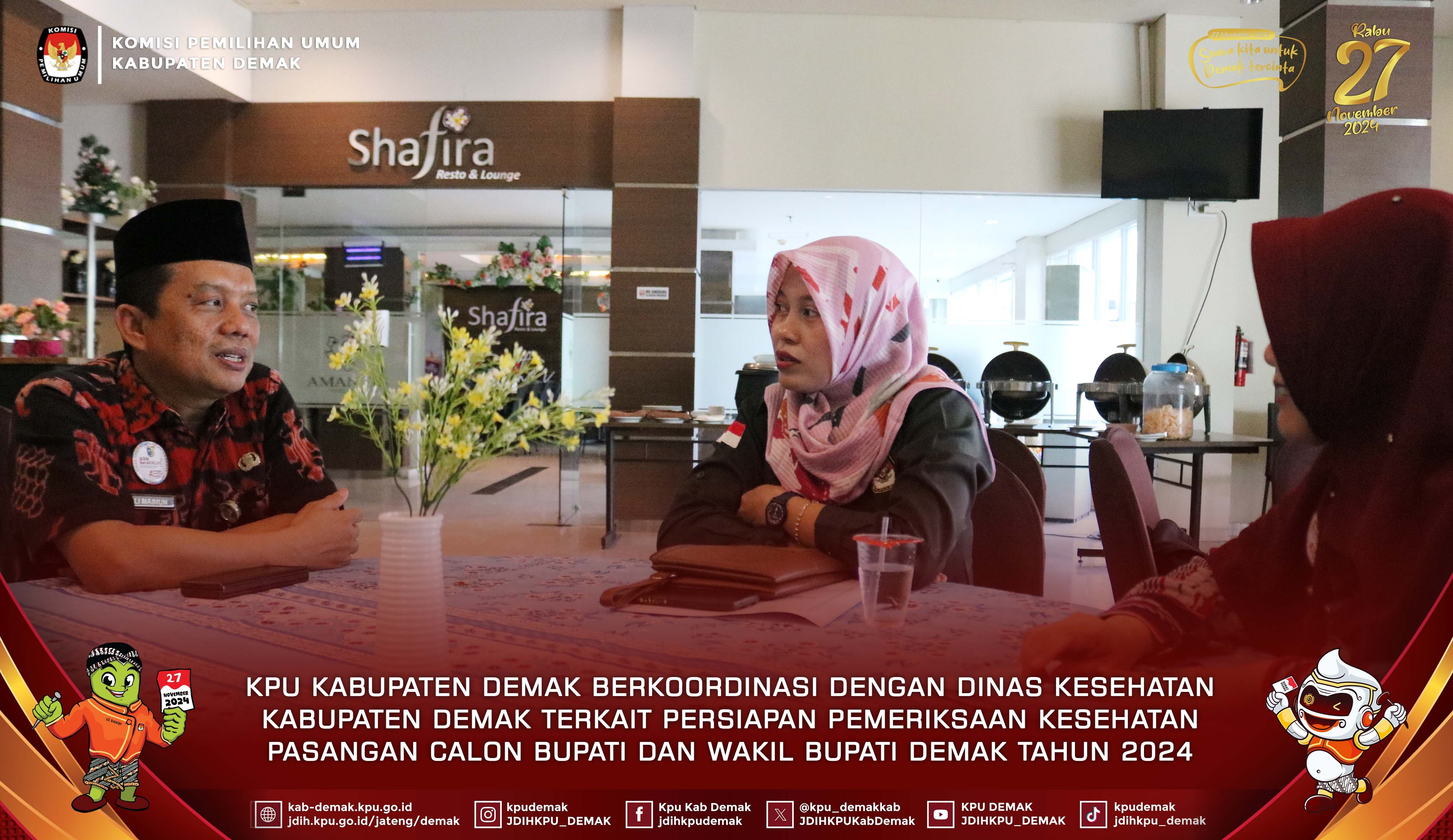 Ketua KPU Kabupaten Demak, Siti Ulfaati dan Anggota KPU Kabupaten Demak Divisi Teknis Penyelenggaraan, Hendi Adi Saputra bertemu langsung dengan Kepala Dinas Kesehatan Kabupaten (DKK) Demak, Ali Maimun yang didampingi Kepala Bidang Pelayanan Kesehatan DKK Demak, Dian Arisanti.