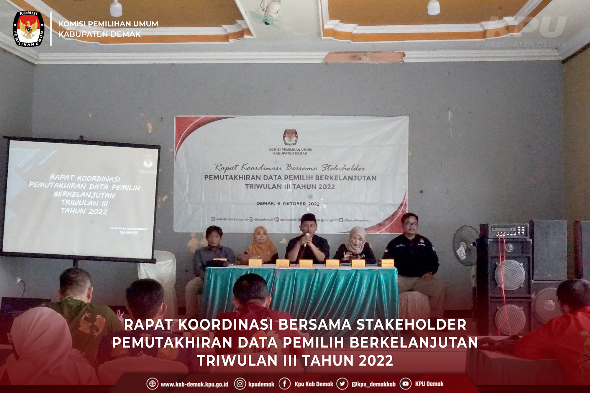 Demak, kab-demak.kpu.go.id – KPU Kabupaten Demak menyelenggarakan kegiatan Rapat Koordinasi Bersama Stakeholder: Pemutakhiran Data Pemilih Berkelanjutan Triwulan Ketiga Tahun 2022 di RUMAH MAKAN Bule Desa Wonosari pada Rabu (5/10/22).