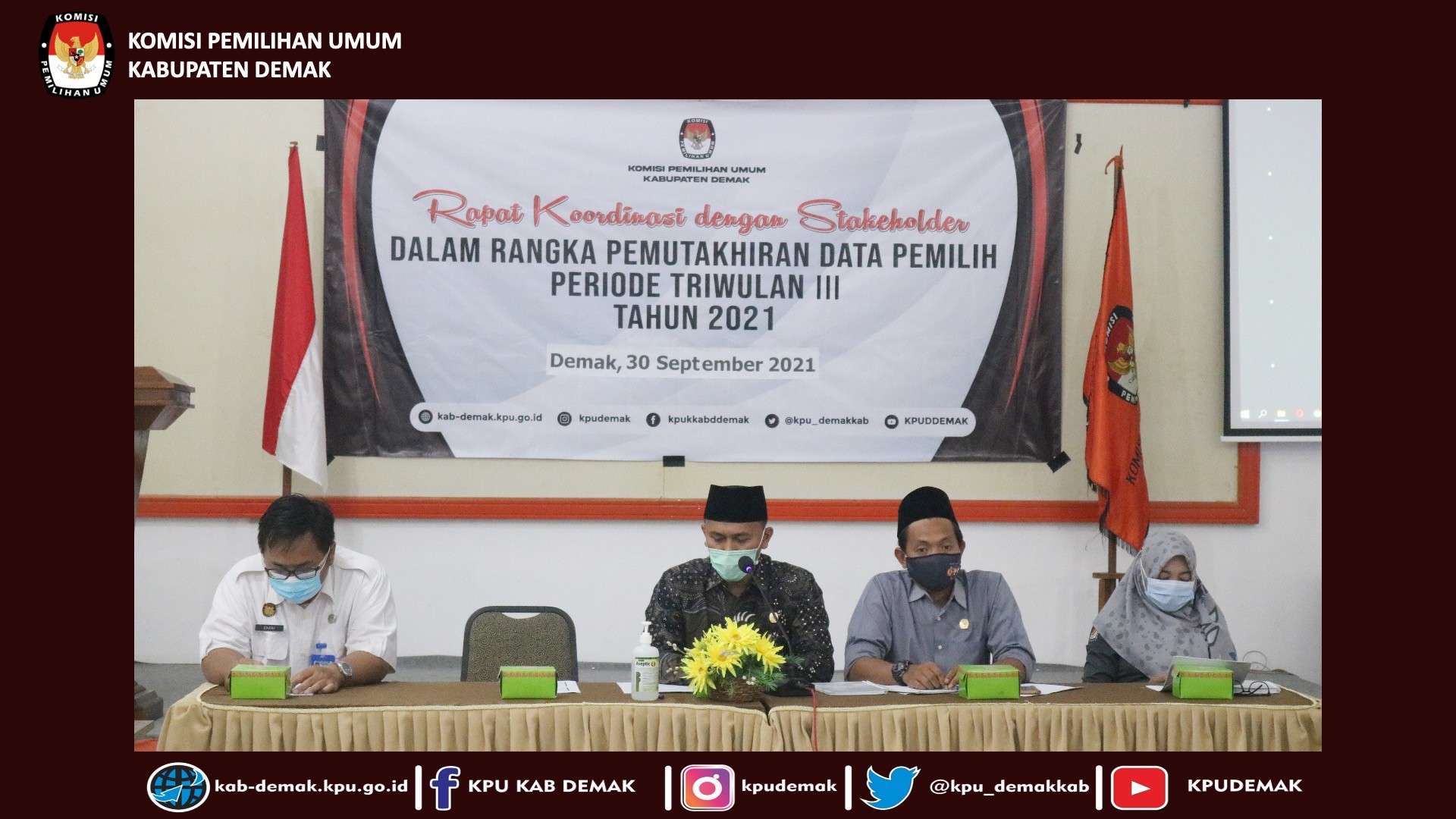 Diharapkan pada pemutakhiran data pemilih berkelanjutan ini KPU Demak mendapatkan banyak masukan guna melakukan Pemutakhiran data pemilih secara periodik baik memasukan potensi pemilih pemula, mencoret pemilih yang TMS ataupun melakukan ubah data agar kualitas daftar pemilih menjadi lebih baik lebih valid dan akurat. Sebelum rakor ini dilaksanakan, KPU Kabupaten Demak melaksanakan pleno Rekapitulasi Daftar Pemilih Berkelanjutan secara tertutup dan disampaikan bahwa Data Pemilih Berkelanjutan semula 853.578 dengan rincian jumlah pemilih laki-laki 426.676 dan jumlah perempuan 426.902; pada periode bulan September ini menjadi 853.616 dengan rincian jumlah pemilih laki-laki 426.679 dan jumlah pemilih perempuan 426.937. Data tersebut tertuang dalam Berita Acara rapat pleno nomor: 19/PL.02.1-BA/3321/KPU-Kab/XI/2021.