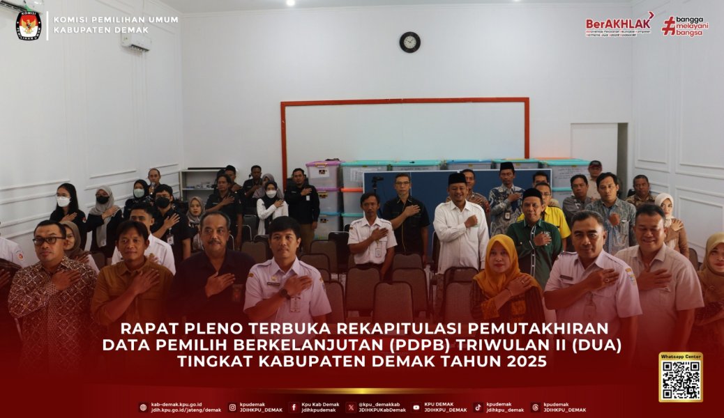 Rapat pleno tersebut dihadiri oleh Ketua dan Anggota KPU Kabupaten Demak beserta jajaran, Bawaslu, Dinas Dukcapil, Polres, dan Kodim, Rutan, Pengadilan Negeri, Pengadilan Agama, Parpol dan Stakeholder terkait lainnya. Kegiatan ini ditutup dengan penandatangan dan penyerahan berita acara rekapitulasi daftar pemilih berkelanjutan.
