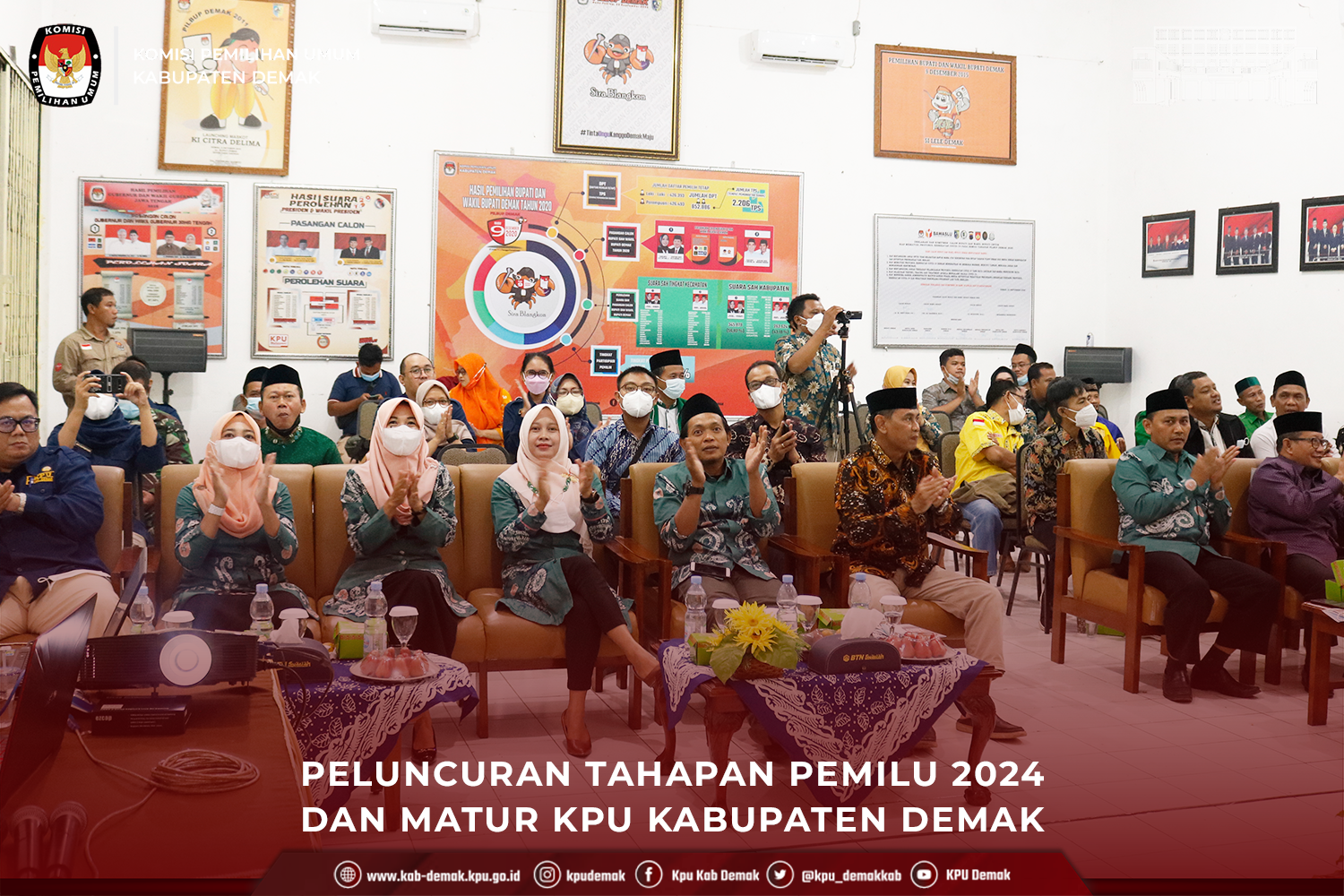 Demak, kab-demak.kpu.go.id – Menjelang 20 bulan menuju Hari Pemungutan Suara Pemilu 2024, KPU RI luncurkan Tahapan Pemilu 2024. Hal tersebut merupakan tindak lanjut dari telah ditetapkannya Hari dan Tanggal Pemungutan Suara Pemilu 2024, yaitu Rabu Legi, 14 Februari 2024. Selain itu, dalam Undang-Undang Nomor 7 Tahun 2017 tentang Pemilihan Umum pada pasal 167 ayat (6) dijelaskan bahwa “Tahapan Penyelenggaraan Pemilu sebagaimana dimaksud pada ayat (4) dimulai paling lambat 20 (dua puluh) bulan sebelum hari pemungutan suara” sehingga Tahapan Pemilu 2024 dimulai tanggal 14 Juni 2022.