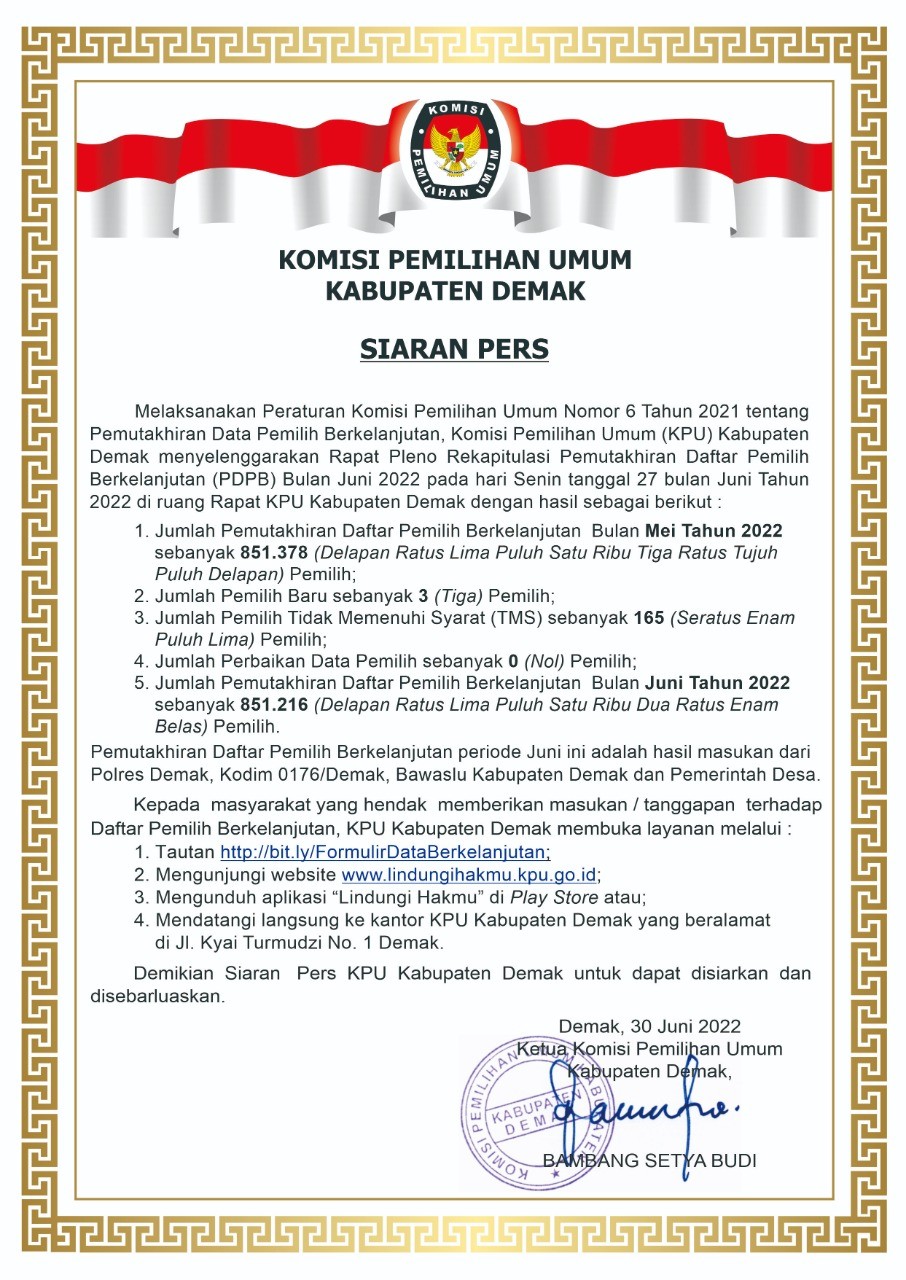 Teman Pemilih, berikut Siaran Pers Pemutakhiran Data Pemilih Berkelanjutan Bulan Juni 2022 KPU Kabupaten Demak: