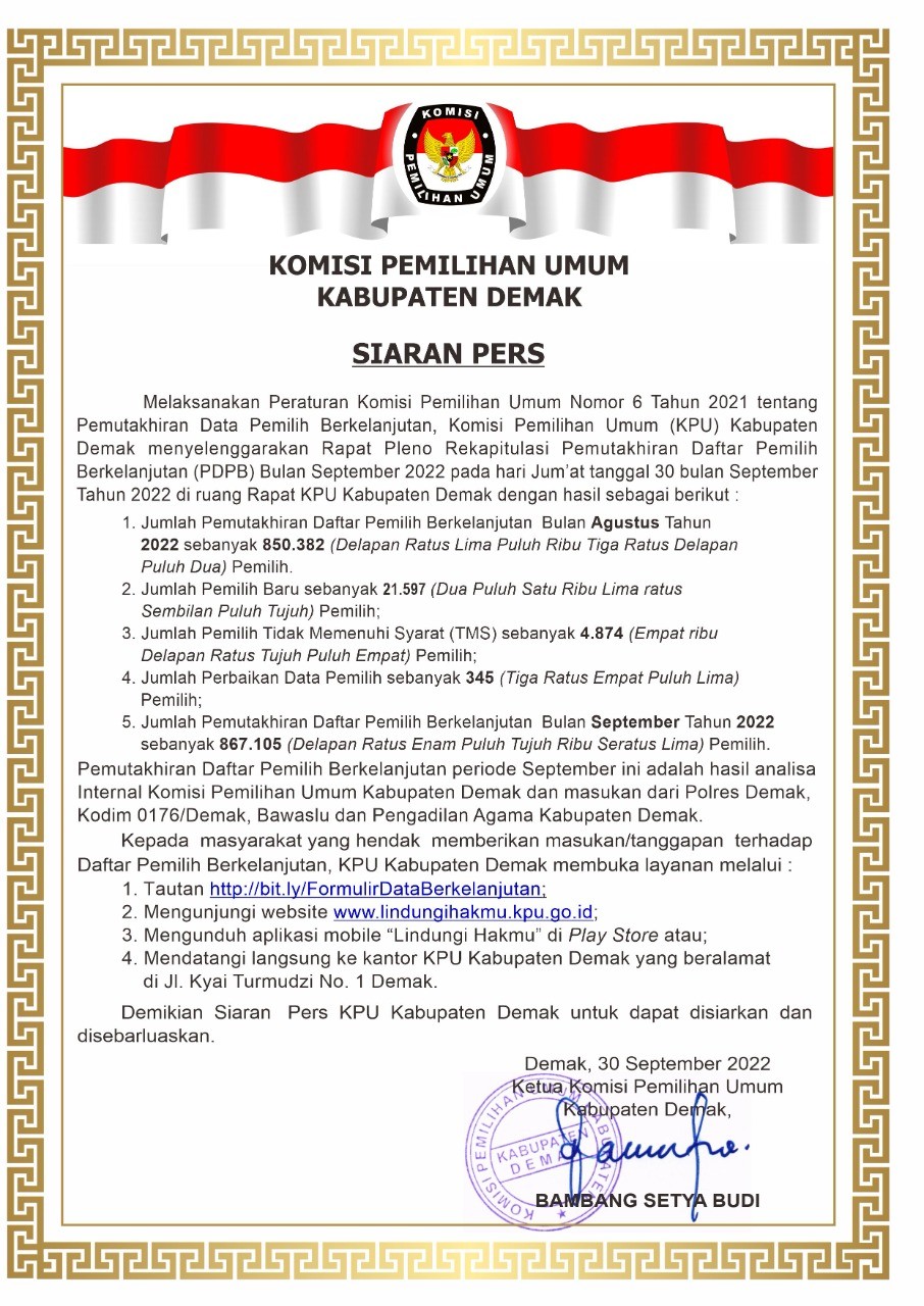 Teman Pemilih, berikut Siaran Pers Pemutakhiran Data Pemilih Berkelanjutan Bulan September 2022 KPU Kabupaten Demak: